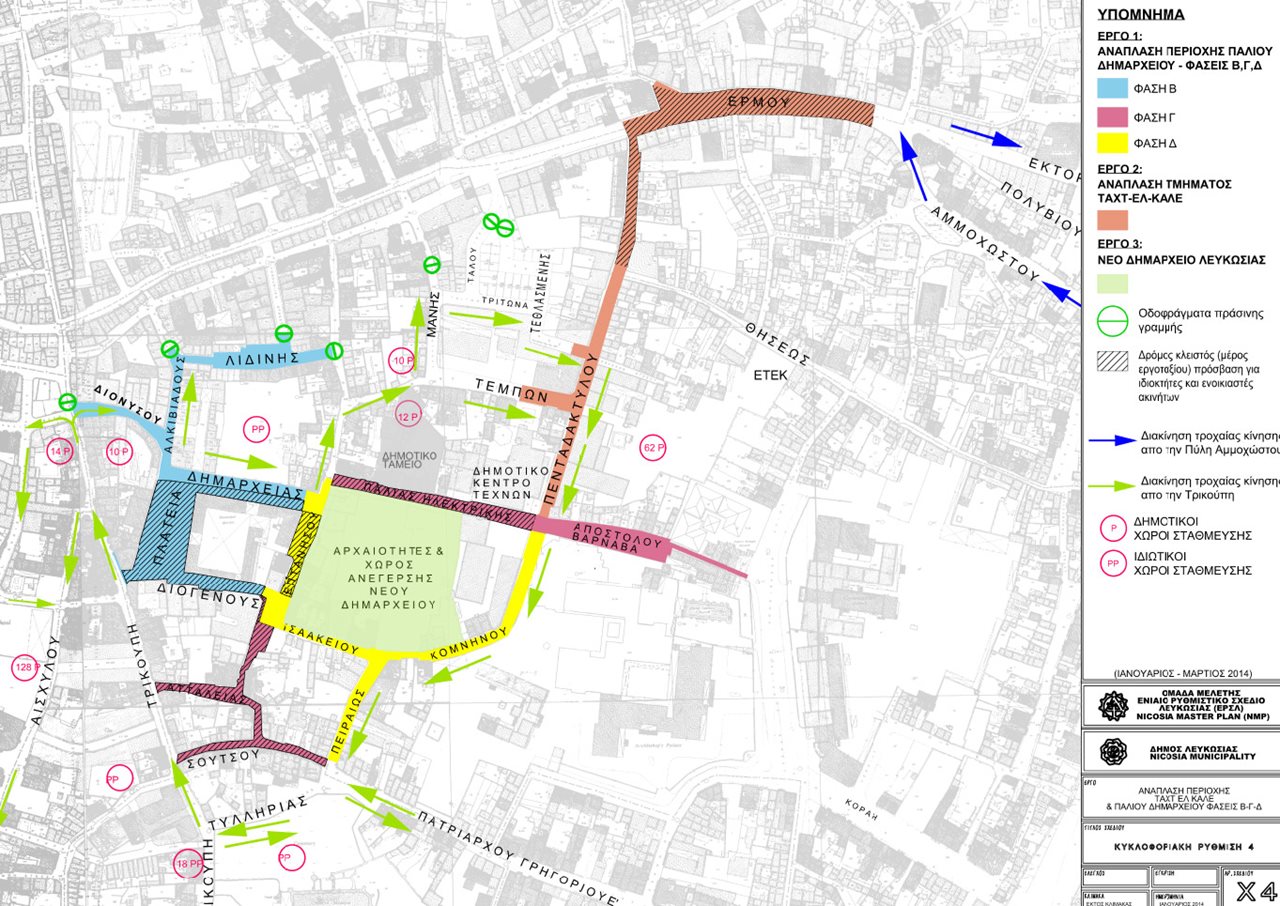 Ο Δήμος Λευκωσίας πληροφορεί το κοινό ότι λόγω των βελτιωτικών έργων που εκτελούνται σε τμήμα της περιοχής Ταχτ-Ελ-Καλέ Φάση Β και Παλιού Δημαρχείου Φάσεις Β και Γ, με σκοπό την αναζωογόνηση της παλιάς πόλης, η οδός Ερμού και Τμήμα της οδού Πενταδακτύλου, από τη συμβολή της με την οδό Θησέως μέχρι τη συμβολή της με την οδό Ερμού, θα είναι προσωρινά κλειστές για τη διακίνηση τροχοφόρων από τη Τετάρτη 22/01/2014 μέχρι και τα μέσα Μάρτιο του 2014. Επίσης θα είναι κλειστές κατά την ίδια περίοδο η πλατεία Δημαρχίας και οι οδοί Διογένους, Παλιάς Ηλεκτρικής, Ατταλείας, Σούτσου και τμήμα της οδού Επτανήσου από την συμβολή της με την οδό Ατταλείας μέχρι τη συμβολή της με την οδό Ισαακείου Κομνηνού. Θα επιτρέπεται η είσοδος μόνο στους κατοίκους και στους χρήστες καταστημάτων.