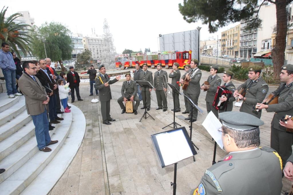 Οι φιλαρμονικές της Εθνικής Φρουράς και της Αστυνομίας έψαλλαν τα κάλαντα της Πρωτοχρονιάς στον Δήμαρχο, Δημοτικούς Συμβούλους και το προσωπικό του Δήμου την Τετάρτη 31 Δεκεμβρίου 2014.