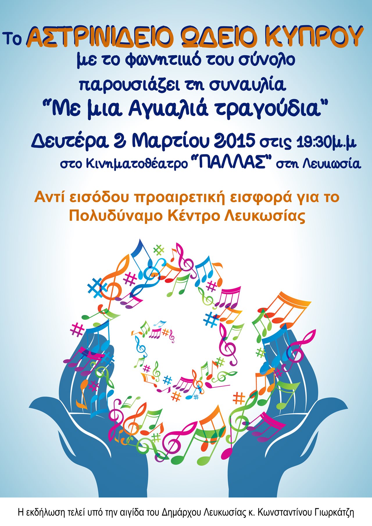 Το Αστρινίδειο Ωδείο Κύπρου με το φωνητικό του σύνολο παρουσιάζει τη συναυλία με τίτλο «Με μια Αγκαλιά Τραγούδια» που θα πραγματοποιηθεί τη Δευτέρα 2 Μαρτίου 2015 στις 19.30 στο Κινηματοθέατρο «Παλλάς» στη Λευκωσίας.