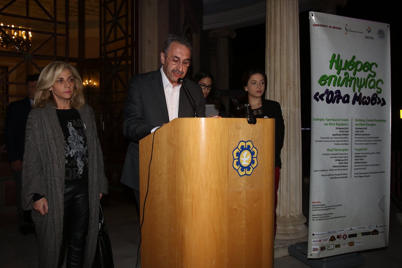 Η Πρόεδρος του Συνδέσμου των φοιτητών της Βιολογίας του Ανθρώπου Μυρτώ Νικολαΐδου στην δική της ομιλία αφού ευχαρίστησε το Δήμο Λευκωσίας και προσωπικά τον Δήμαρχο κ. Γιωρκάτζη για τη στήριξη στις εκδηλώσεις κάτω από τον γενικό τίτλο «Ημέρες επιληψίας – Όλα Μωβ», αναφέρθηκε στο γεγονός ότι οι εκδηλώσεις που διοργανώνονται έχουν στόχο την ευαισθητοποίηση και την ενημέρωση του κοινού για την επιληψία.  Ελπίζουμε, είπε, ότι έτσι να βάλουμε και εμείς το λιθαράκι μας ενάντια στην προκατάληψη και την ελλιπή πληροφόρηση που υπάρχει στην κοινωνία μας για αυτή τη διαταραχή.  Η ορθή πληροφόρηση είναι αναγκαία για τη στήριξη των ατόμων που πάσχουν από επιληψία και ιδιαίτερα σήμερα που η επιστήμη διαθέτει αρκετά μέσα για την αντιμετώπιση της. Και αφορά ένα σημαντικό αριθμό ατόμων αφού διεθνώς 0.5% μέχρι 1% του πληθυσμού πάσχει από επιληψία. Αυτά τα ποσοστά συναντούνται και στο νησί μας.