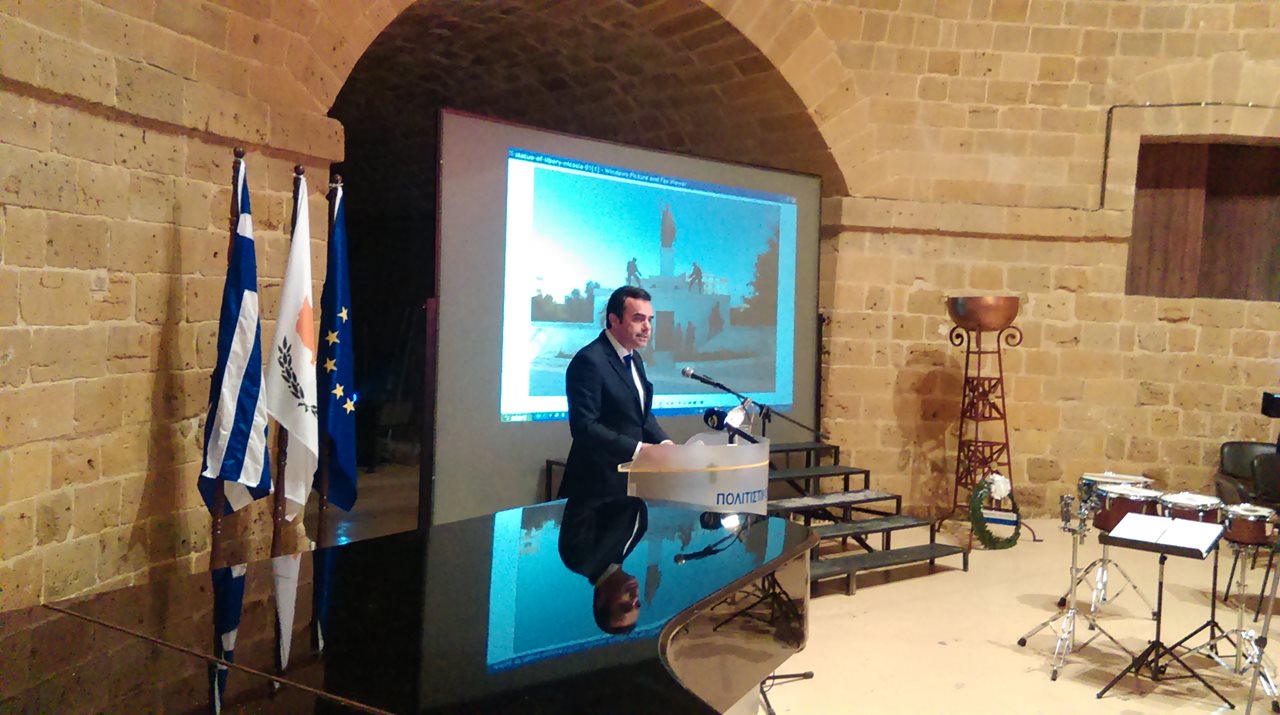 Ο Δήμαρχος κ. Γιωρκάτζης στην ομιλία του ανέφερε ανάμεσα σε άλλα, «ότι αυτές τις μέρες ο Κυπριακός Ελληνισμός γιορτάζει την Επέτειο που εκφράζει την αγάπη του Έλληνα προς την Ελευθερία και συμβολίζει βωμούς θυσίας για την απόκτησή της.