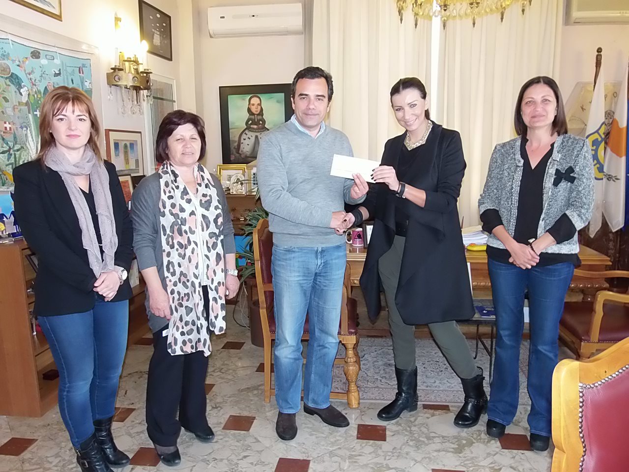 Η Πρόεδρος της Ελληνικής Τράπεζας κυρία Ειρένα Γεωργιάδου, παρέδωσε στον Δήμαρχο Λευκωσίας, Κωνσταντίνο Γιωρκάτζη, επιταγή ύψους 5.000 ευρώ τη Δευτέρα 6 Απριλίου 2015 παρουσία της Προέδρου της Επιτροπής Πρόνοιας, κυρίας Μέλιας Αβράαμ και της εκπροσώπου του «Αγκαλιάζω» κυρίας Ελένης Γιωρκάτζη.