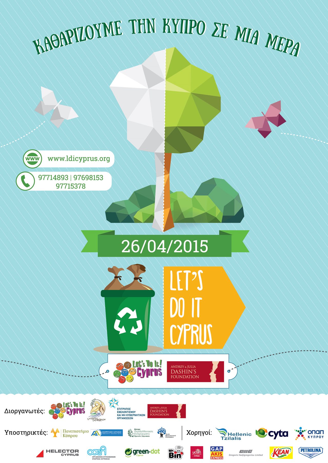 O Δήμος Λευκωσίας συμμετέχει για τρίτη συνεχόμενη χρονιά έχοντας ενεργό και ουσιαστικό ρόλο στην τρίτη παγκύπριας εμβέλειας εκστρατεία εθελοντικού καθαρισμού με την ονομασία ‘Let’s do it Cyprus!’ Η εκστρατεία καθαρισμού ‘Let’s do it Cyprus!’ - ΚΑΘΑΡΙΖΟΥΜΕ ΤΗΝ ΚΥΠΡΟ ΣΕ ΜΙΑ ΜΕΡΑ, αποτελεί μέρος της παγκόσμιας καμπάνιας ‘Let’s do it World!’, όπου συμμετέχουν περισσότερες από 100 χώρες, συμπεριλαμβανομένης και της Κύπρου. Η ιδέα δημιουργήθηκε το έτος 2008 στην Εσθονία και πραγματοποιείται στο νησί μας υπό την αιγίδα του Γραφείου της Επιτρόπου Περιβάλλοντος όπου συμμετέχουν οργανωμένα σύνολα, Δήμοι και άλλοι Φορείς. Φέτος η εν λόγω εκστρατεία θα πραγματοποιηθεί την Κυριακή 26 Απριλίου 2015.