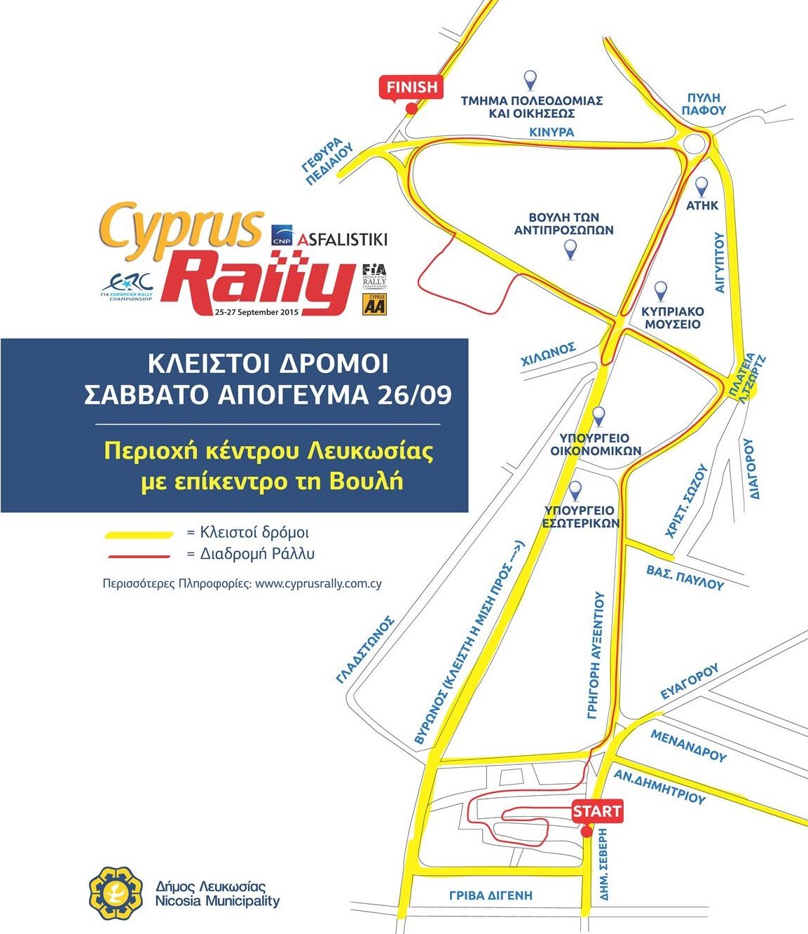 Ο Δήμος Λευκωσίας υποδέχεται και φέτος το Διεθνές Ράλλυ Κύπρου 2015 στην πρωτεύουσα. Το Σάββατο 26 Σεπτεμβρίου 2015, μετά τις 15:00, δρόμοι του κέντρου της πόλης με επίκεντρο την Βουλή, θα είναι κλειστοί για την διεξαγωγή της υπερειδικής διαδρομής της Λευκωσίας.