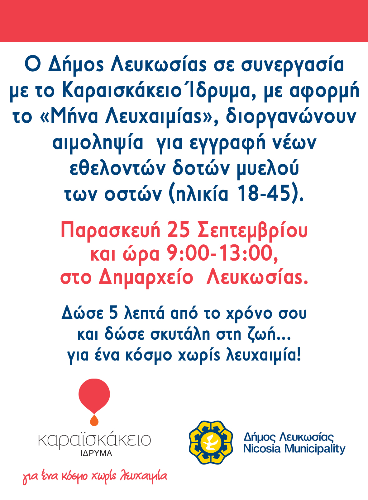 ΕΝΗΜΕΡΩΣΗ / Ανακοινώσεις / Ανακοινώσεις 2015 / Ο Δήμος Λευκωσίας διοργανώνει αιμοληψία για δότες μυελού των οστών για το Καραϊσκάκιο Ίδρυμα