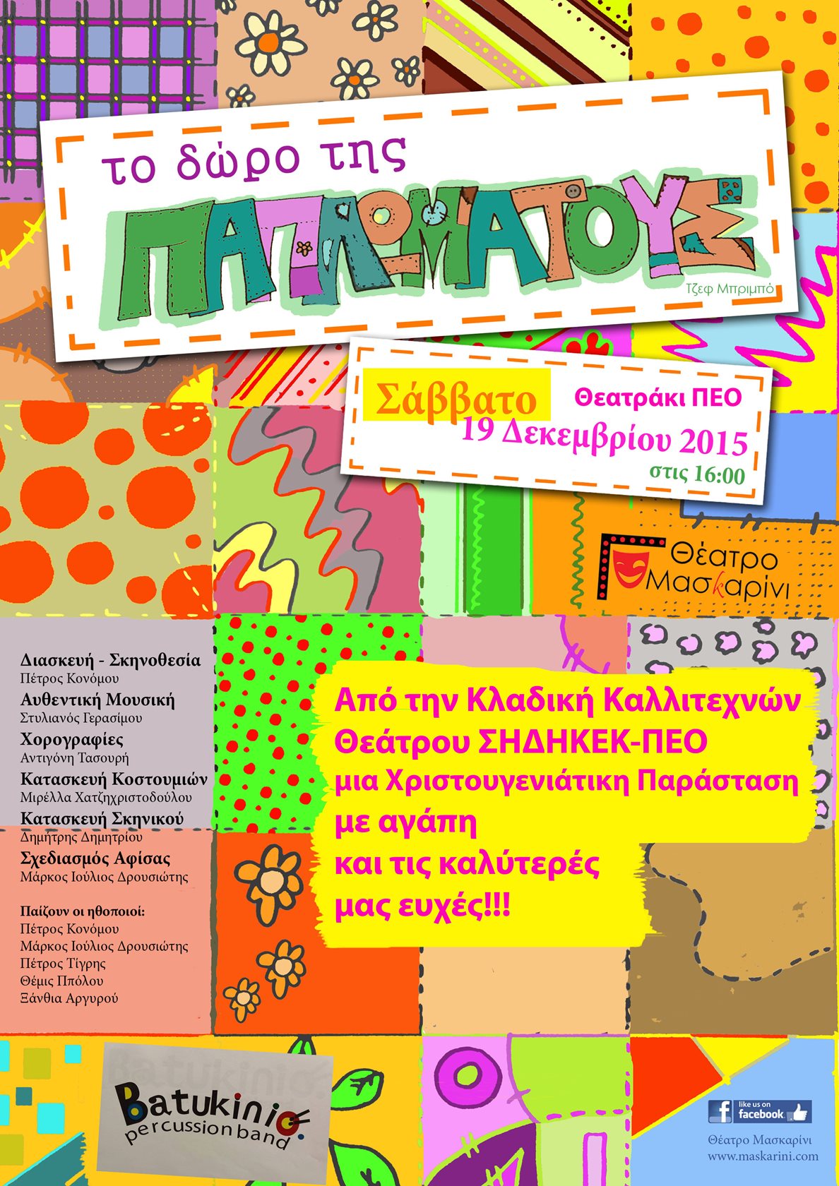 Η παράσταση θα πραγματοποιηθεί στις 19 Δεκεμβρίου 2015 και μεταξύ άλλων τα παιδιά θα έχουν την ευκαιρία να παρακολουθήσουν το θεατρικό έργο «Το δώρο της ΠΑΠΛΩΜΑΤΟΥΣ», προσφορά του Θεάτρου Μασκαρίνι, καθώς και να απολαύσουν την ανεπανάληπτη ομάδα κρουστών Batukinio.