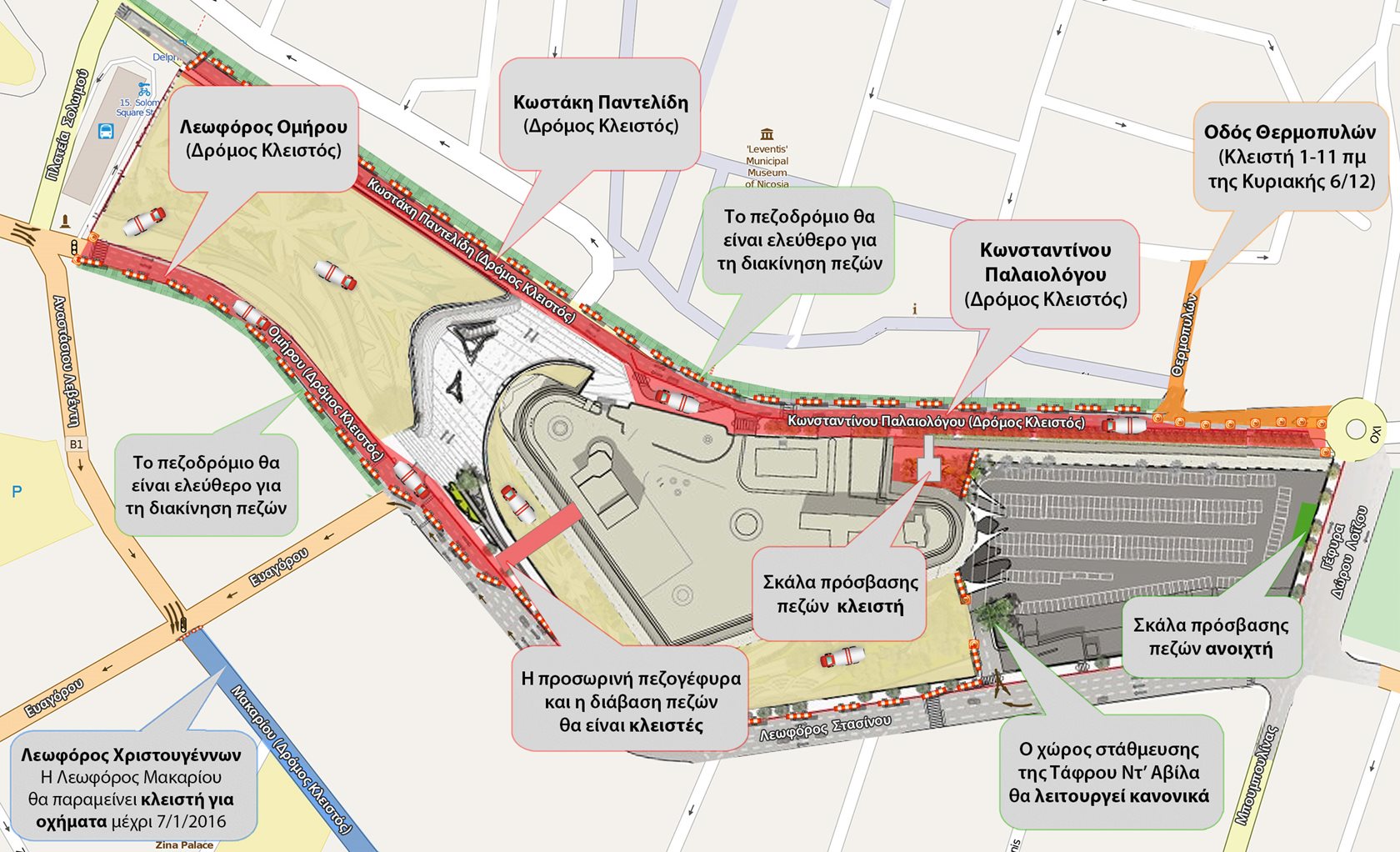 - Η στάθμευση κατά μήκος των οδών Κωνσταντίνου Παλαιολόγου και Κωστάκη Παντελίδη δεν θα επιτρέπεται από τις 5 μ.μ. το Σάββατο 5 Δεκεμβρίου 2015 γι’ αυτό όλα τα οχήματα θα πρέπει να έχουν μετακινηθεί.