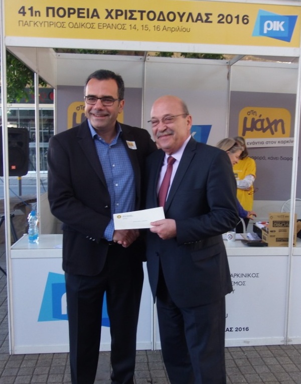 Ο Δήμαρχος Λευκωσίας Κωνσταντίνος Γιωρκάτζης παρέδωσε εισφορά στον Πρόεδρο του Αντικαρκινικού Συνδέσμου Κύπρου Αδάμο Αδάμου σε εκδήλωση για την Πορεία Χριστοδούλας 2016 που πραγματοποιήθηκε στην οδό Λήδρας στις 14 Απριλίου 2016.