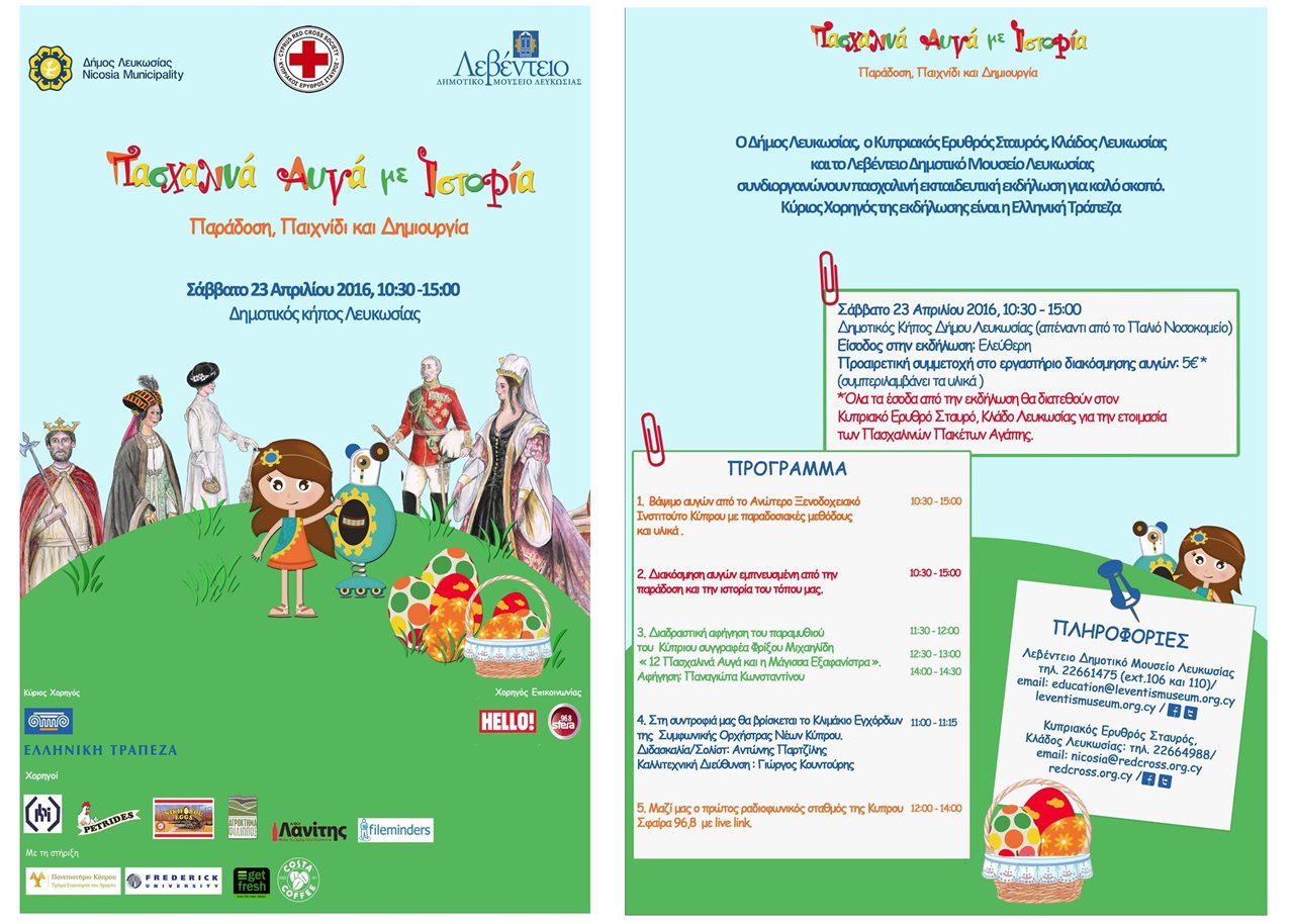 Ο Δήμος Λευκωσίας, ο Κυπριακός Ερυθρός Σταυρός, Κλάδος Λευκωσίας και το Λεβέντειο Δημοτικό Μουσείο Λευκωσίας συνδιοργανώνουν πασχαλινή εκπαιδευτική εκδήλωση για καλό σκοπό. Η κυπριακή παράδοση και ιστορία συνθέτουν τη μοναδική αυτή εκδήλωση με τίτλο «ΠΑΣΧΑΛΙΝΑ ΑΥΓΑ ΜΕ ΙΣΤΟΡΙΑ: Παράδοση, Παιχνίδι και Δημιουργία» η οποία θα πραγματοποιηθεί το Σάββατο 23 Απριλίου 2016, στον Δημοτικό Κήπο του Δήμου Λευκωσίας από τις 10:30 έως τις 15:00.
