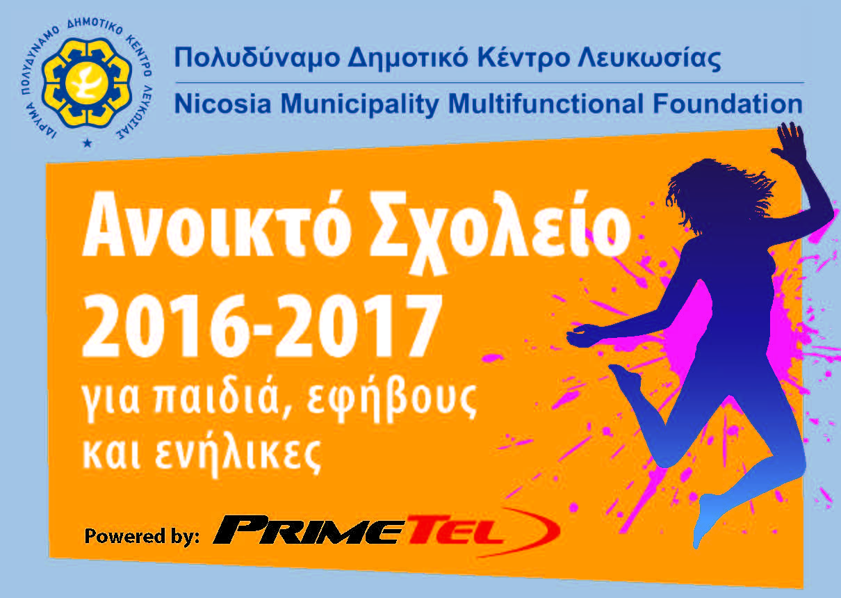 Το Πολυδύναμο Δημοτικό Κέντρο Λευκωσίας ανακοινώνει την έναρξη εγγραφών του Β’ τετραμήνου της «Ανοικτής Σχολικής Χρονιάς 2016-2017», με έναρξη μαθημάτων στις 13/2/2017 και ολοκλήρωση τους, περί τα μέσα Ιουνίου 2017. Το κόστος συμμετοχής ανέρχεται στα 60 ευρώ ανά δραστηριότητα και περιλαμβάνει πέραν των 15 εκπαιδευτικών εβδομάδων, για τις πιο κάτω δραστηριότητες: