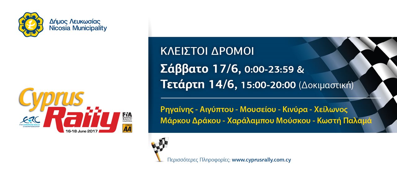 Ο Δήμος Λευκωσίας υποδέχεται και φέτος το Διεθνές Ράλλυ Κύπρου 2017 στην πρωτεύουσα. Το Σάββατο 17 Ιουνίου 2017 θα γίνει η Ειδική Διαδρομή στο Κέντρο της Λευκωσίας. Για την διεξαγωγή της ειδικής διαδρομής της Λευκωσίας οι πιο κάτω δρόμοι, με επίκεντρο τον κυκλικό κόμβο Μάρκου Δράκου παρά την Πύλη Πάφου, θα είναι κλειστοί από τις 0:00 μέχρι και τις 23:59:
