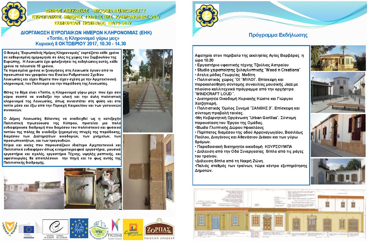 Ο Δήμος Λευκωσίας σε συνεργασία με το Τμήμα Πολεοδομίας και Οικήσεως συμμετέχει και φέτος στη διοργάνωση των Ευρωπαϊκών Ημερών Κληρονομιάς 2017 την Κυριακή 8 Οκτωβρίου 2017 στις 10:30π.μ., με θέμα «Τοπίο: η κληρονομιά γύρω μας» που έχει σαν κύριο σκοπό να αναδείξει την πολιτιστική κληρονομιά της Λευκωσίας όπως συναντάται στη φύση και στο τοπίο, μέσα και έξω από την περιοχή Καϊμακλίου και των γειτονικών συνοικιών.