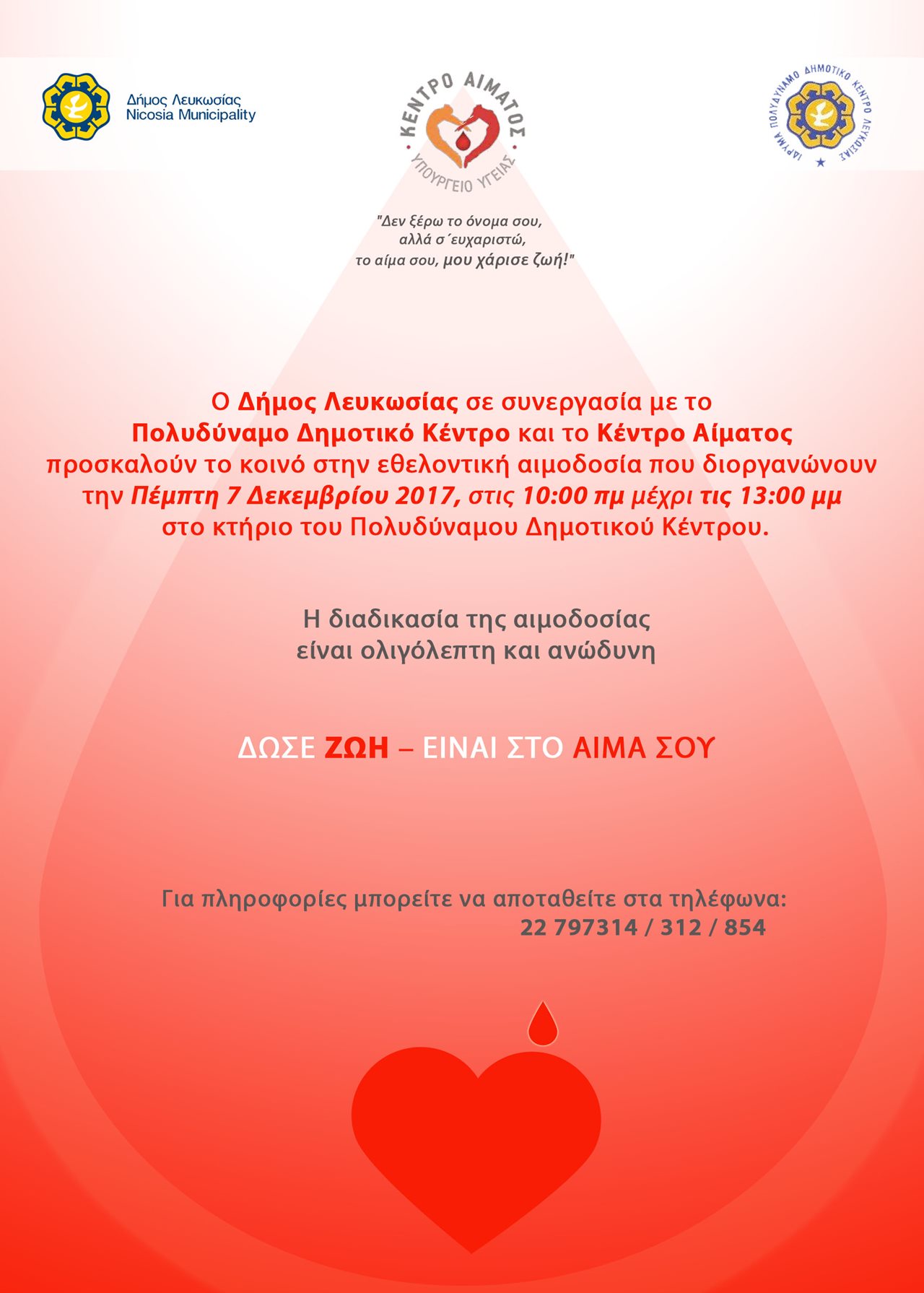 Στο πλαίσιο του καθιερωμένου θεσμού αιμοδοσίας του Δήμου Λευκωσίας, πραγματοποιείται αιμοδοσία την Πέμπτη 7 Δεκεμβρίου 2017 στο Πολυδύναμο Δημοτικό Κέντρο (πρώην Γηροκομείο), μεταξύ των ωρών 10:00π.μ μέχρι 13:00μ.μ.