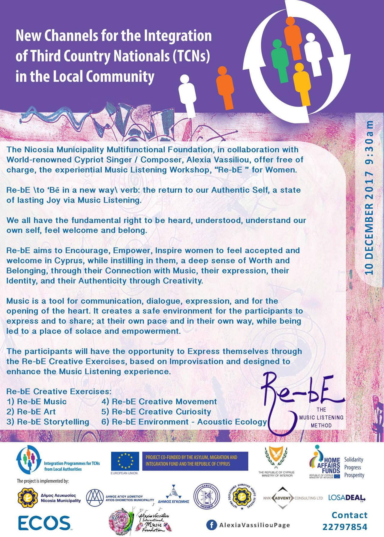 Το Πολυδύναμο Δημοτικό Κέντρο Λευκωσίας σε συνεργασία με τη διεθνούς φήμης μουσικοσυνθέτρια Αλέξια Βασιλείου, προσφέρει την Κυριακή 10 Δεκεμβρίου 2017, ώρα 9:30, στο Πολυδύναμο Κέντρο, εντελώς δωρεάν, το μουσικό- καλλιτεχνικό εργαστήρι «Re-bE» σε γυναίκες Υπηκόους Τρίτων Χωρών στο πλαίσιο του Έργου «Προγράμματα ένταξης από Τοπικές Αρχές» - Πρόγραμμα «Νέοι Δρόμοι για την Ένταξη ΥΤΧ στην τοπική κοινωνία» με συγχρηματοδότηση από το Ταμείο Ασύλου, Μετανάστευσης και Ένταξης και την Κυπριακή Δημοκρατία.
