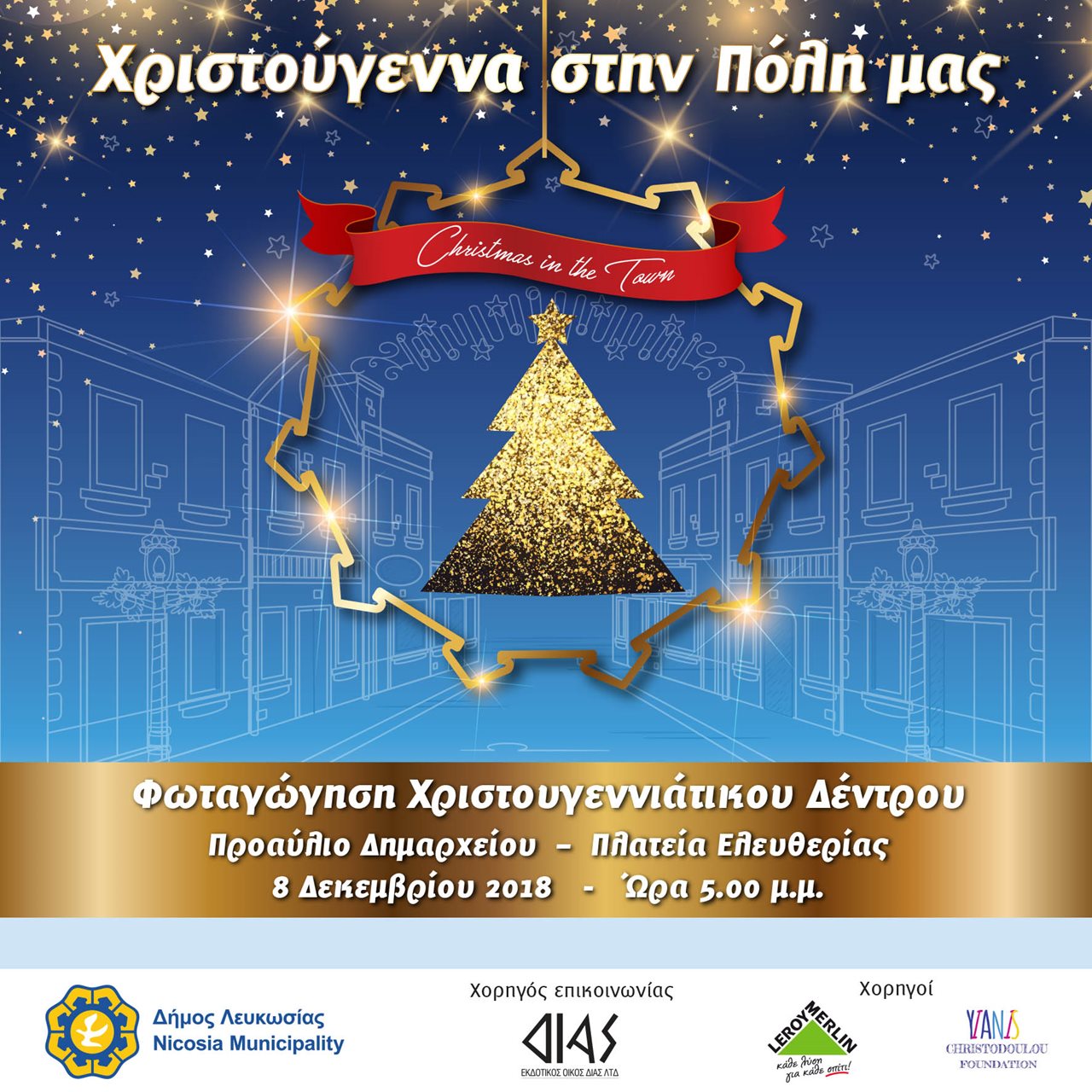 Ο Δήμος Λευκωσίας σας προσκαλεί το Σαββάτο 8 Δεκεμβρίου και ώρα 5.00μ.μ. στο Προαύλιο του Δημαρχείου στην Πλατεία Ελευθερίας για τη φωταγώγηση του Χριστουγεννιάτικου Δέντρου που θα σημάνει την έναρξη των εκδηλώσεων του Χριστουγεννιάτικου Χωριού, οι οποίες θα διαρκέσουν μέχρι τις 5 Ιανουαρίου 2019.