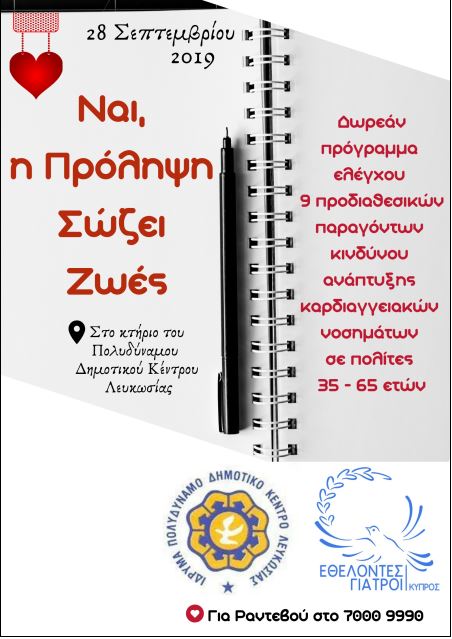 Η οργάνωση Εθελοντές Γιατροί-Κύπρος σε συνεργασία με το Πολυδύναμο του Δήμου Λευκωσίας, σας προσκαλούν να συμμετάσχετε ΔΩΡΕΑΝ στο Πρόγραμμα Πρόληψης και Πρώιμης Διάγνωσης Παραγόντων Κινδύνου για τις Καρδιαγγειακές Παθήσεις, στις 28 Σεπτεμβρίου 2019, στο κτήριο του Πολυδύναμου Δημοτικού Κέντρου, στη Λεωφ. Νικηφόρου Φωκά 40 (πλησίον Πύλης Αμμοχώστου), από τις 7:30 π.μ. μέχρι τις 11:30 π.μ., κατόπιν ραντεβού. Το πρόγραμμα απευθύνεται σε πολίτες των ηλικιών 35-65 ετών.