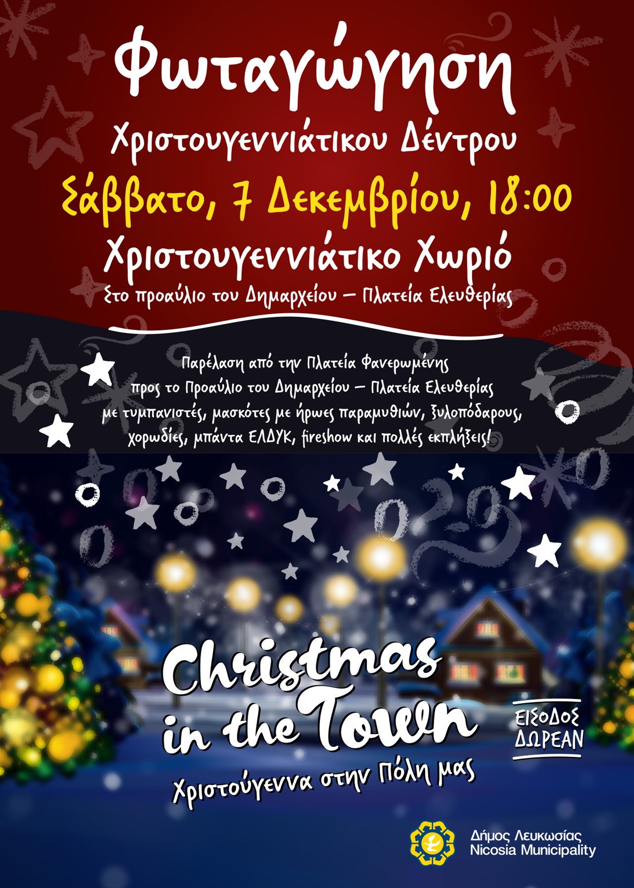 Ο Δήμος Λευκωσίας προσκαλεί μικρούς και μεγάλους στη φωταγώγηση του Χριστουγεννιάτικου Δέντρου το Σάββατο 7 Δεκεμβρίου 2019 και ώρα 18:00, στο προαύλιο του Δημαρχείου Λευκωσίας στην Πλατεία Ελευθερίας.