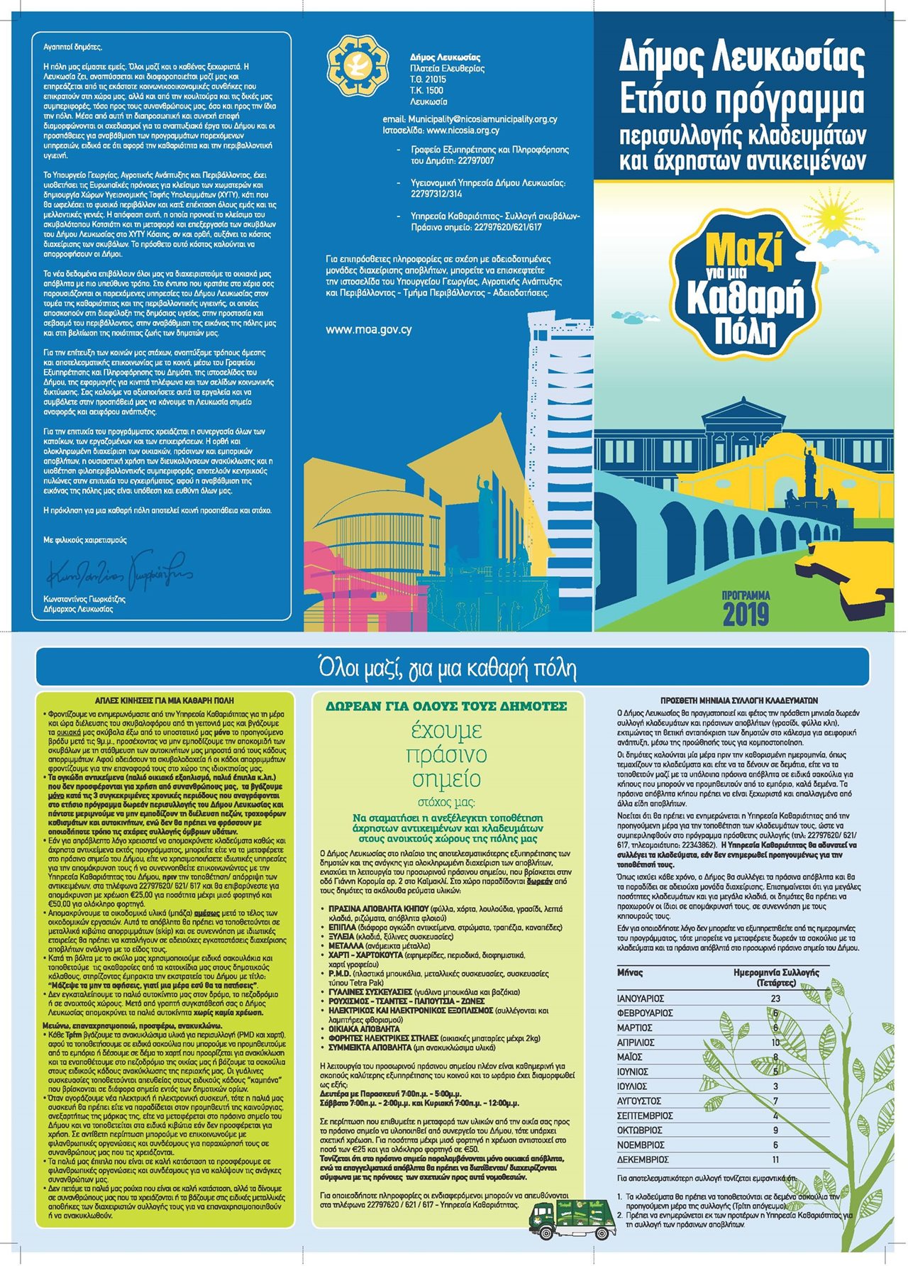 Ο Δήμος Λευκωσίας πληροφορεί τους δημότες ότι άρχισε η διανομή του εντύπου για το χρονιαίο πρόγραμμα καθαριότητας του 2019, το οποίο περιέχει τις ημερομηνίες των εκστρατειών δωρεάν συλλογής ογκωδών αντικειμένων και κλαδευμάτων. Η πρώτη εκστρατεία αρχίζει τον Φεβρουάριο.