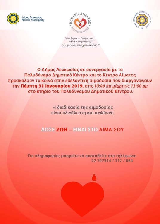 Προσκαλούνται όσοι δημότες θέλουν να δώσουν αίμα και να προσφέρουν αυτό το πολύτιμο δώρο στους συμπολίτες μας να προσέλθουν στο Πολυδύναμο Δημοτικό Κέντρο στην οδό Νικηφόρου Φωκά 40, Λευκωσία.
