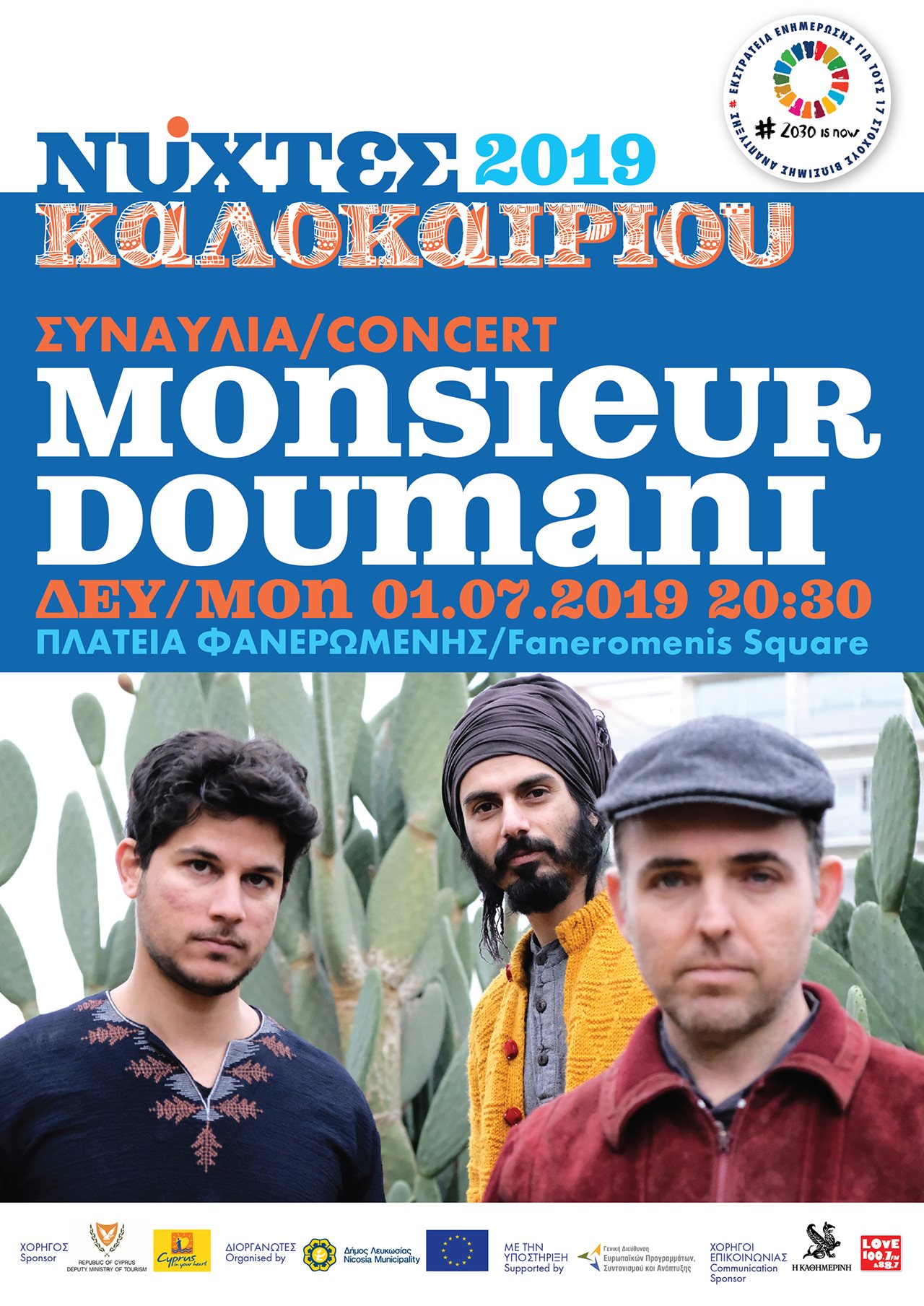 Χορηγός των εκδηλώσεων Νύχτες Καλοκαιριού 2019 είναι το Υφυπουργείο Τουρισμού, Διοργανωτές των εκδηλώσεων είναι ο Δήμος Λευκωσίας. Χορηγοί Επικοινωνίας η εφημερίδα η Καθημερινή και το ραδιόφωνο LoveFM.