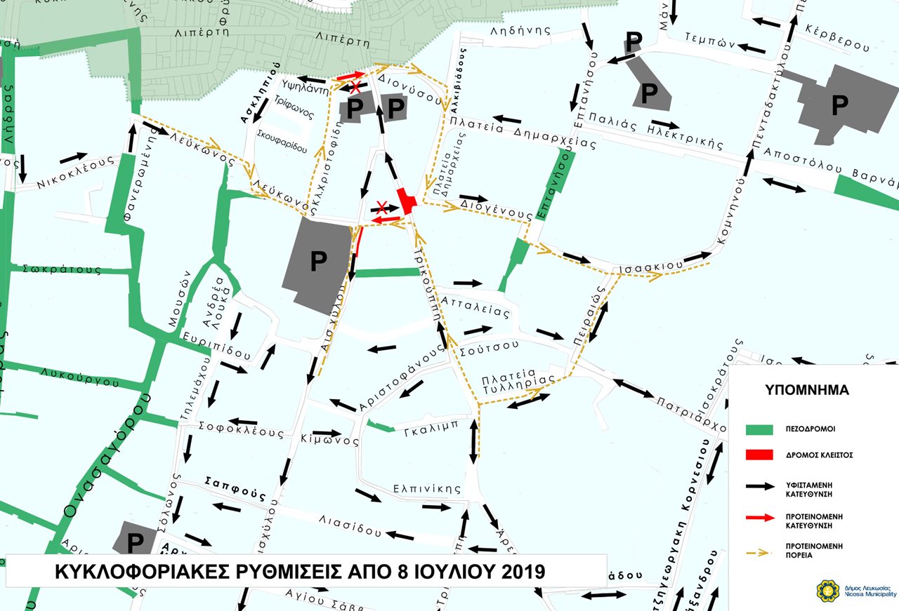 Η πρόσβαση στην Πλατεία Δημαρχείας για τα οχήματα που κινούνται στην οδό Λεύκωνος θα είναι εφικτή μέσω της οδού Χριστοφίδη και από το τέρμα της οδού Χριστοφίδη προς τα δεξιά στην οδό Διονύσου (της οποίας η μονοδρόμηση αντιστρέφεται με επιτρεπόμενη πορεία προς την Πλατεία Δημαρχείας). Η πορεία αυτή θα επιτρέπεται μόνο για οχήματα μέχρι 7 μέτρα μήκος.