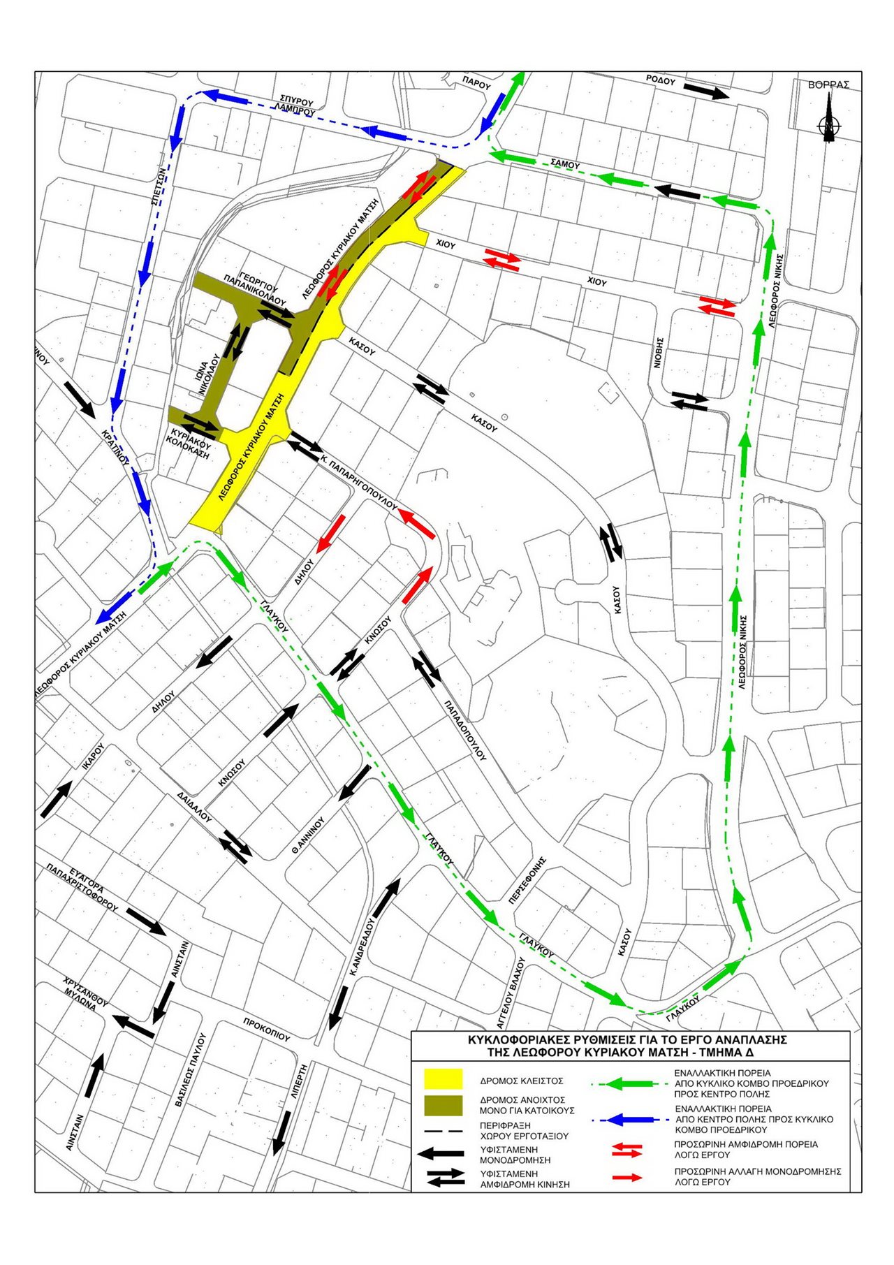 Κατά τη διάρκεια των εργασιών στο τμήμα Δ’ δεν θα επιτρέπεται η διακίνηση οχημάτων, στο τμήμα της Κυριάκου Μάτση από την οδό Γλαύκου μέχρι και οδό Κάσου, ενώ το τμήμα της από την οδό Γεωργίου Παπανικολάου μέχρι την οδό Σάμου οι εργασίες θα γίνουν πρώτα στο ένα μέρος του δρόμου της Κυριάκου Μάτση και μετά στο υπόλοιπο ώστε να υπάρχει συνεχής πρόσβαση και να μπορούν να εξυπηρετούνται οι κάτοικοι των οδών Γεωργίου Παπανικολάου, Ιωνά Νικολάου και Κυριάκου Κολοκάση, όπως και τα οχήματα ασφαλείας και τροφοδοσίας.