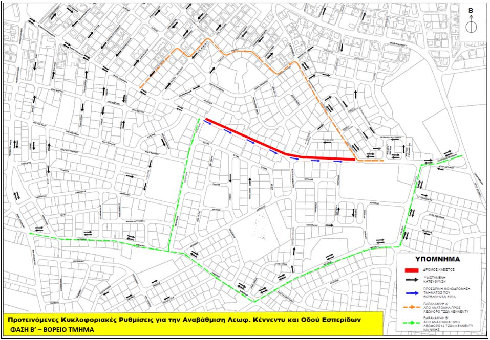 Η κυκλοφορία προς το δυτικό τμήμα της Λεωφόρου Κέννεντυ θα πραγματοποιείται είτε μέσω των οδών Καρπενησίου, Πέντε Πηγαδίων, Γοργίου, Γερ. Μαρκορά, Α. Αραούζου, Αλασίας, Αγαπήνωρος, είτε μέσω των οδών Στασίνου, Ιφιγενείας, Αρμενίας, Εσπερίδων,όπως παρουσιάζονται στο σχετικό σχεδιάγραμμα. Η κυκλοφορία προς τις παρόδους δε θα διαφοροποιηθεί, ενώ κατάλληλη σήμανση θα τοποθετηθεί σε όσες παρόδους θα καταστούν προσωρινά αδιέξοδοι.