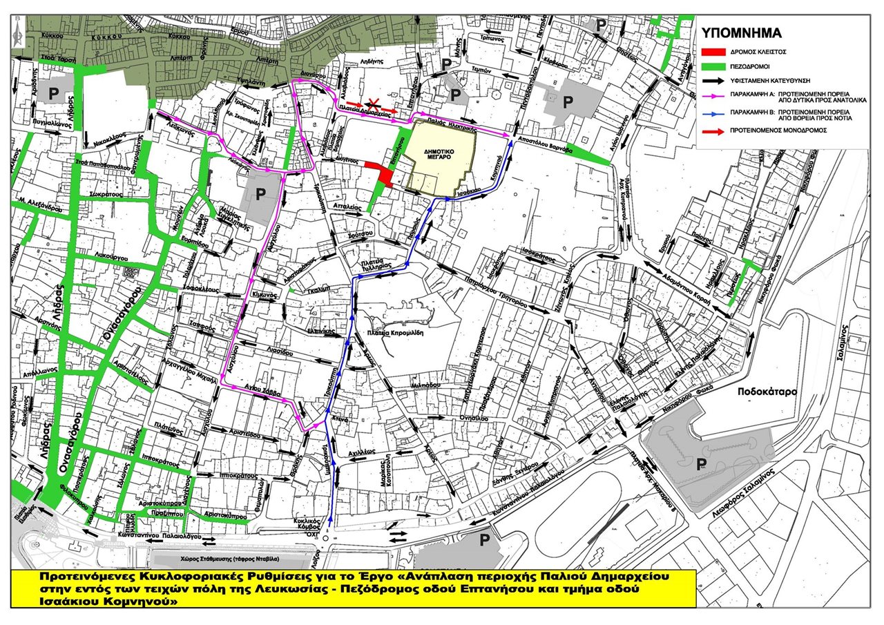 * Για τη διακίνηση από δυτικά προς ανατολικά της παλιάς πόλης, τα οχήματα μπορούν να διακινούνται από την οδό Λεύκωνος – Τρικούπη - Διονύσου - Πλ. Δημαρχίας και Παλιάς Ηλεκτρικής με κατεύθυνση την οδό Πενταδακτύλου. Αντίστοιχα, με κατεύθυνση προς την οδό Ισαακίου Κομνηνού, τα οχήματα μπορούν να διακινούνται από την οδό Λεύκωνος - Αισχύλου - Αγίου Σάββα - Τρικούπη - Πλ. Τυλληρίας - Πειραιώς.