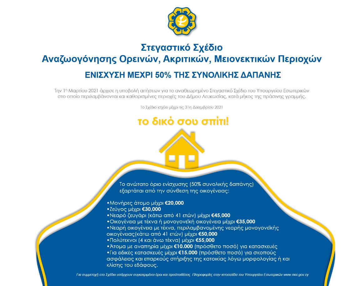 Από την 1η Μαρτίου 2021 άρχισε η υποβολή αιτήσεων για το αναθεωρημένο Στεγαστικό Σχέδιο Αναζωογόνησης Ορεινών, Ακριτικών και Μειονεκτικών Περιοχών του Υπουργείου Εσωτερικών, στο οποίο περιλαμβάνονται και καθορισμένες περιοχές που εμπίπτουν στα όρια του Δήμου, κατά μήκος της πράσινης γραμμής.