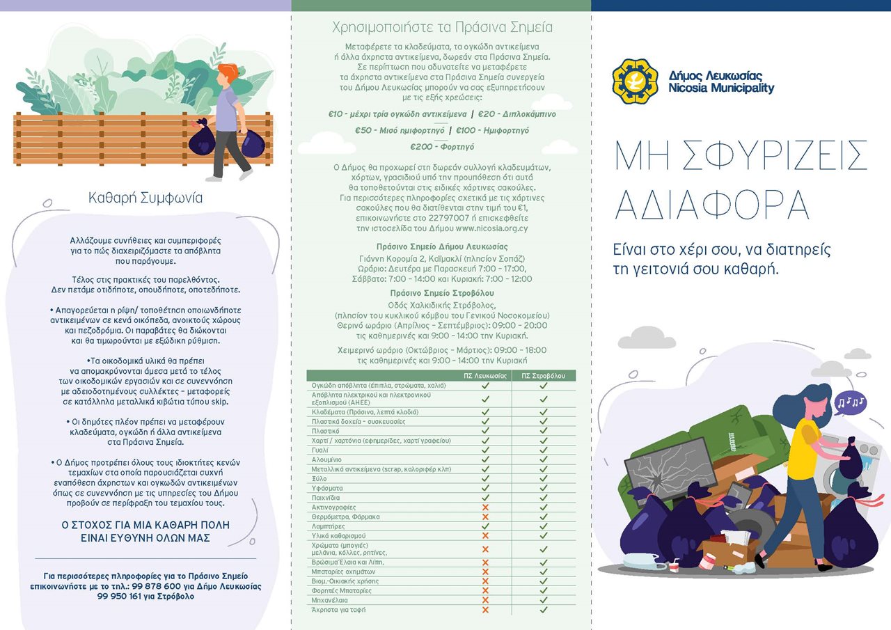 Υπενθυμίζεται ότι οι δημότες μπορούν να μεταφέρουν κλαδεύματα και αντικείμενα στο πράσινο σημείο του Δήμου Λευκωσίας που βρίσκεται στο χώρο του τμήματος Καθαριότητας, στην οδό Γιάννη Κορομία 2 στο Καϊμακλί και στο πράσινο σημείο Στροβόλου, στην οδό Χαλκιδικής – πλησίον του κυκλικού κόμβου του Γενικού Νοσοκομείου Λευκωσίας. Στα πράσινα σημεία παραλαμβάνονται δωρεάν διάφορες κατηγορίες αποβλήτων που προέρχονται