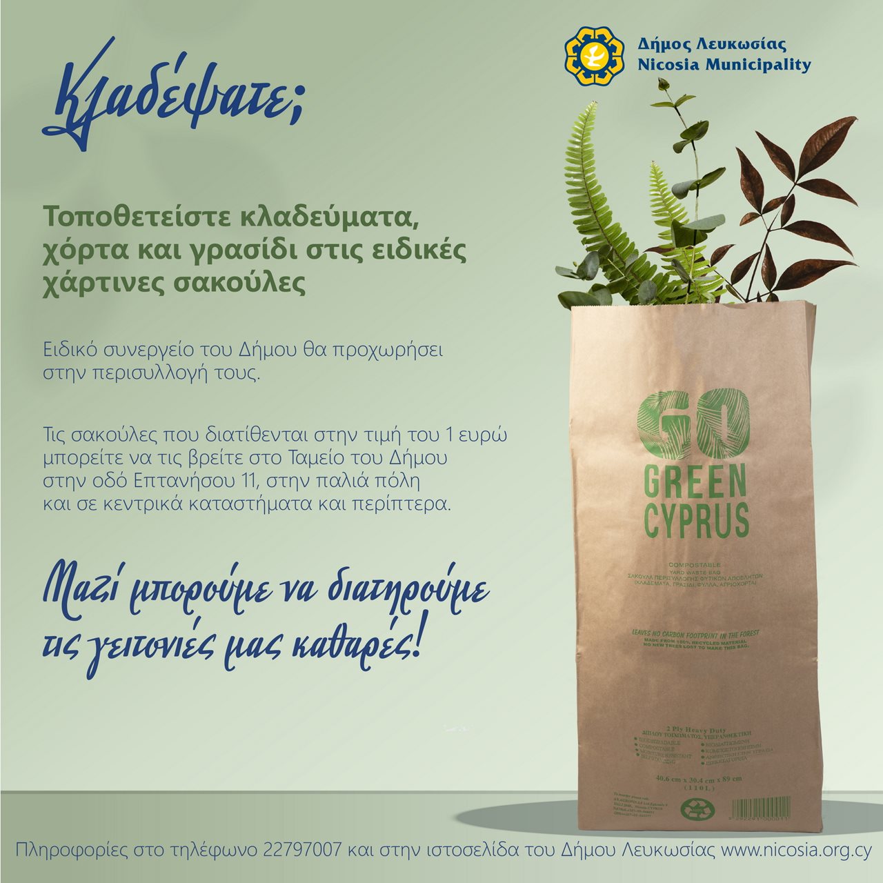 Ο Δήμος Λευκωσίας, ενισχύει τις προσπάθειες που καταβάλλει για τη διατήρηση της καθαριότητας στην πόλη με την εφαρμογή προγράμματος δωρεάν περισυλλογής κλαδευμάτων, χόρτων, γρασιδιού υπό την προϋπόθεση ότι αυτά θα τοποθετούνται σε ειδικές χάρτινες σακούλες.