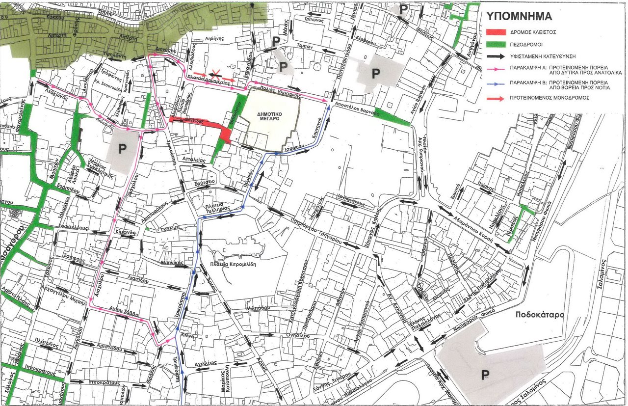 * Για τη διακίνηση από δυτικά προς ανατολικά της παλιάς πόλης, τα οχήματα μπορούν να διακινούνται από την οδό Λεύκωνος - Τρικούπη - Διονύσου - Πλ. Δημαρχίας και Παλιάς Ηλεκτρικής με κατεύθυνση την οδό Πενταδακτύλου. Αντίστοιχα, με κατεύθυνση προς την οδό Ισαακίου Κομνηνού, τα οχήματα μπορούν να διακινούνται από την οδό Λεύκωνος - Αισχύλου - Αγίου Σάββα - Τρικούπη - Πλ. Τυλληρίας - Πειραιώς.