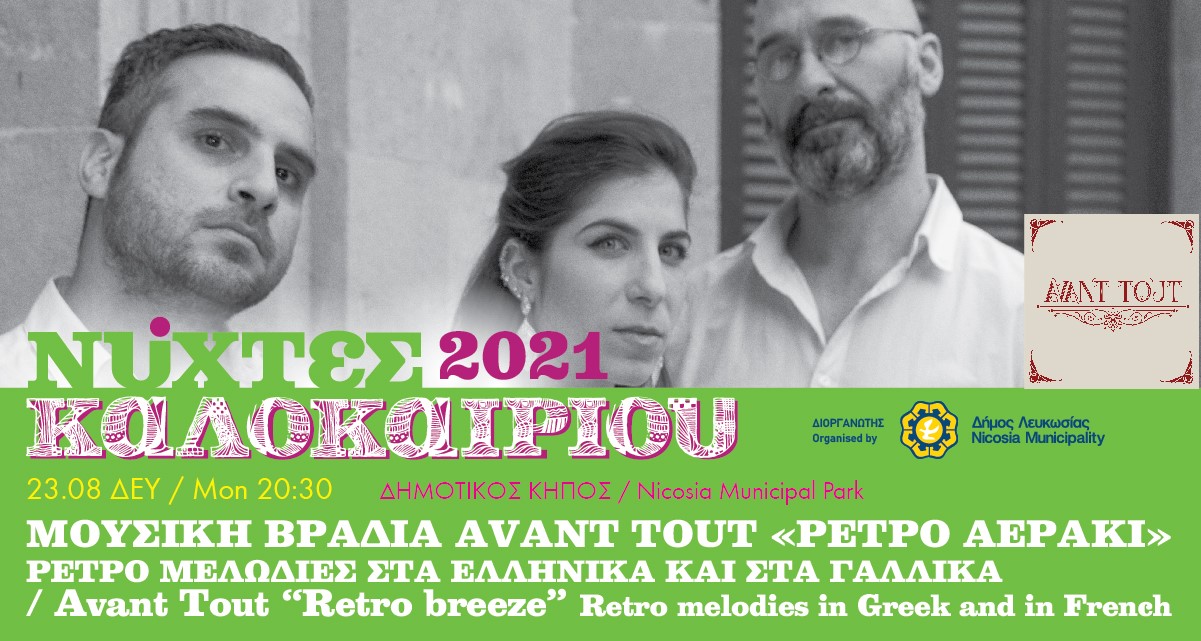 Με νοσταλγική διάθεση και έντονο το παριζιάνικο στυλ, οι Avant Tout μας ταξιδεύουν τη Δευτέρα 23 Αυγούστου 2021 στο Δημοτικό Κήπο Λευκωσίας, στο δικό τους Μικρό Παρίσι της Λευκωσίας, προσφέροντας μια μουσική βραδιά με τίτλο «Ρετρό Αεράκι» με μελωδίες στα ελληνικά και στα γαλλικά.