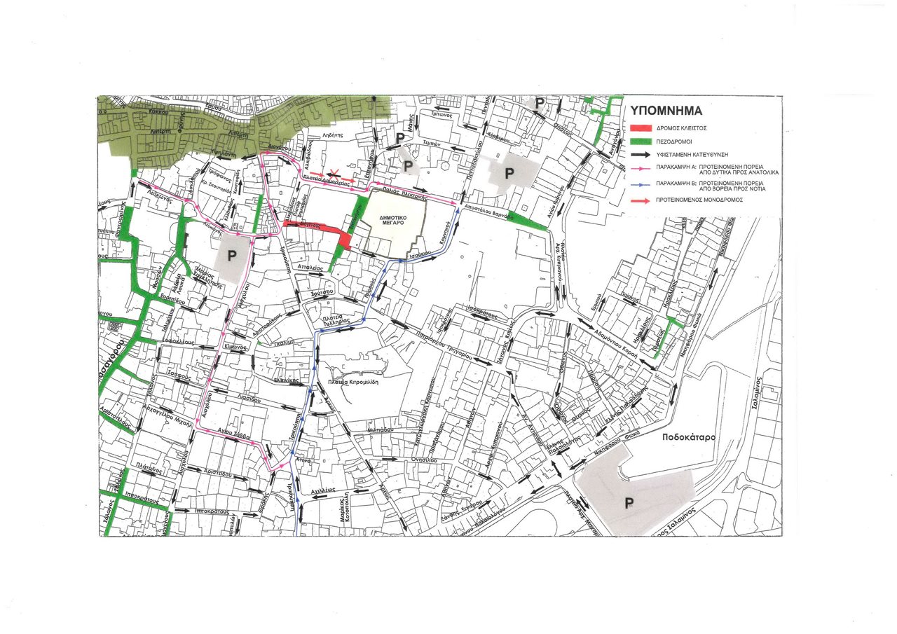 * Για τη διακίνηση από δυτικά προς ανατολικά της παλιάς πόλης, τα οχήματα μπορούν να διακινούνται από την οδό Λεύκωνος - Τρικούπη - Διονύσου - Πλ. Δημαρχίας και Παλιάς Ηλεκτρικής με κατεύθυνση την οδό Πενταδακτύλου. Αντίστοιχα, με κατεύθυνση προς την οδό Ισαακίου Κομνηνού, τα οχήματα μπορούν να διακινούνται από την οδό Λεύκωνος - Αισχύλου - Αγίου Σάββα - Τρικούπη - Πλ. Τυλληρίας - Πειραιώς.