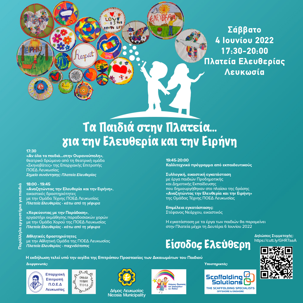 Η Ομάδα Τέχνης ΠΟΕΔ Λευκωσίας συνδιοργανώνει με το Δήμο Λευκωσίας εκδήλωση για τα παιδιά, με την ευκαιρία της Ημέρας του Παιδιού, το Σάββατο 4 Ιουνίου 2022 από τις 17:30 μέχρι τις 20:00 στην Πλατεία Ελευθερίας με τίτλο: «Τα Παιδιά στην Πλατεία….για την Ελευθερία και την Ειρήνη».