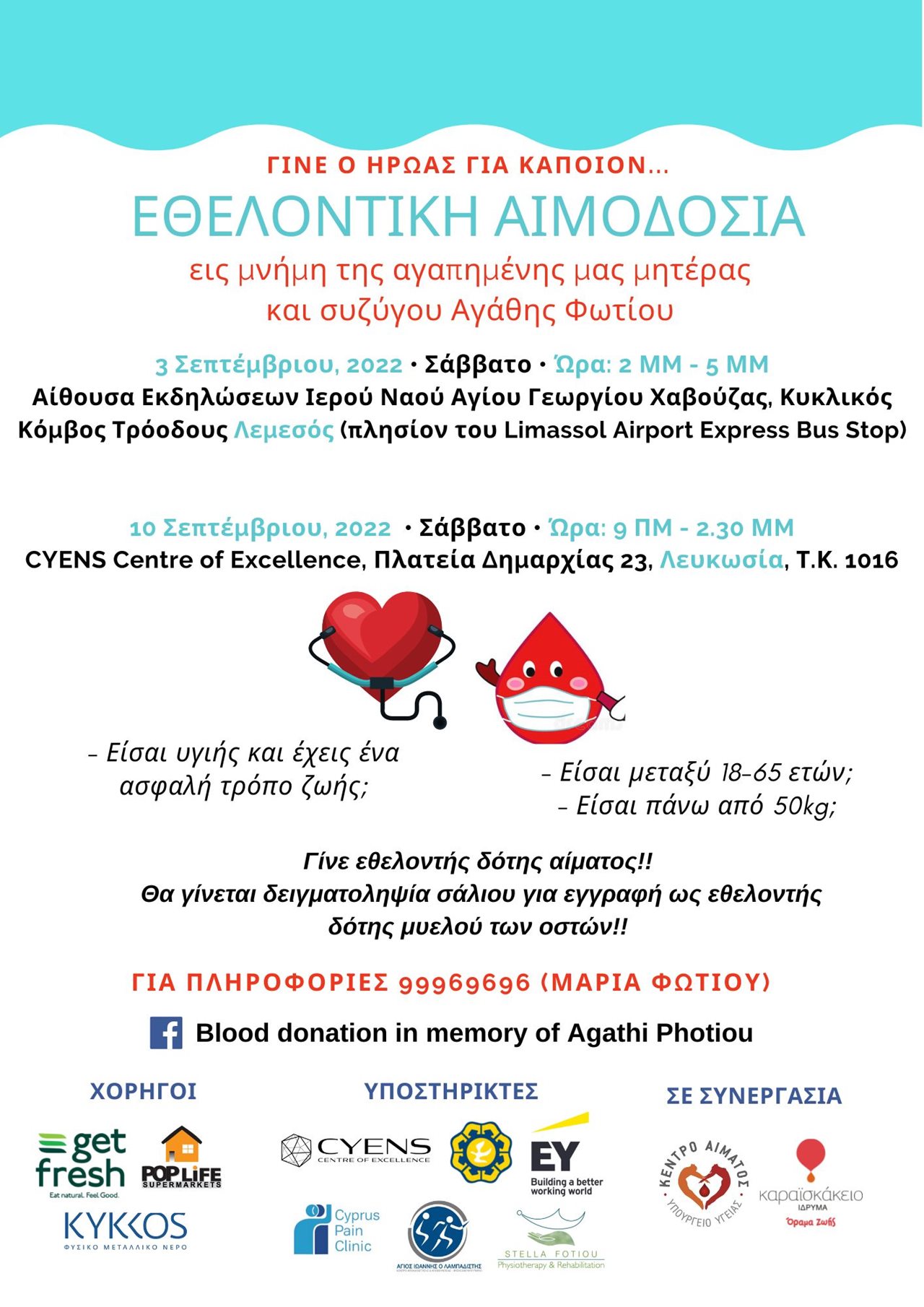 Θα διεξαχθούν δύο αιμοδοσίες με τη στήριξη των Κέντρων Αριστείας CYENS, Δήμου Λευκωσίας, Κέντρο Πόνου Κύπρος, EY Cyprus, Κέντρο Αποκατάστασης & Αποθεραπείας - Φυσικοθεραπευτήριο Άγιος Ιωάννης ο Λαμπαδιστής και Κέντρο Φυσικοθεραπείας και Αποκατάστασης Στέλλα Φωτίου.