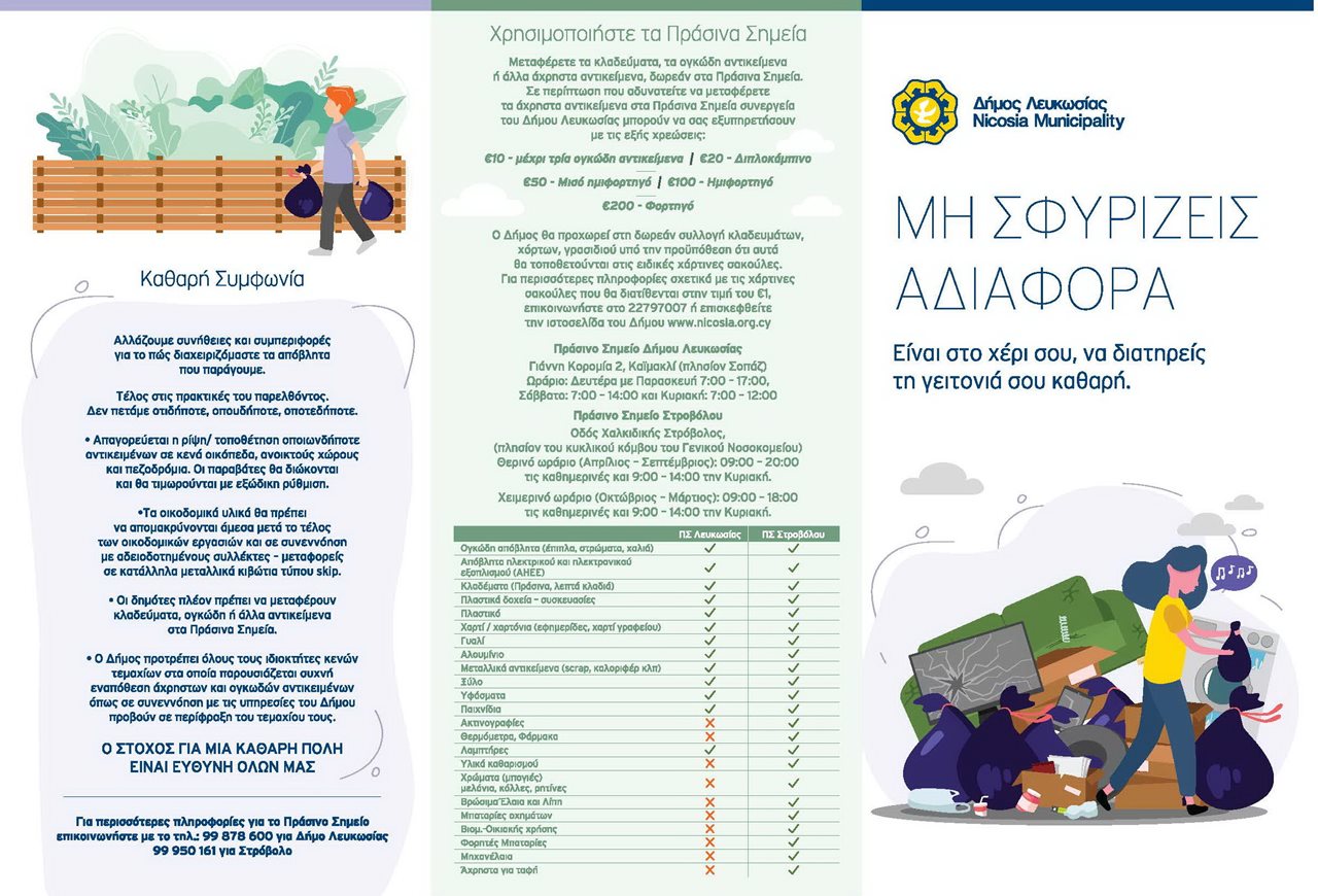 Υπενθυμίζεται ότι οι δημότες μπορούν να μεταφέρουν κλαδεύματα και αντικείμενα στο πράσινο σημείο του Δήμου Λευκωσίας που βρίσκεται στο χώρο του τμήματος Καθαριότητας, στην οδό Γιάννη Κορομία 2 στο Καϊμακλί και στο πράσινο σημείο Στροβόλου, στην οδό Χαλκιδικής – πλησίον του κυκλικού κόμβου του Γενικού Νοσοκομείου Λευκωσίας. Στα πράσινα σημεία παραλαμβάνονται δωρεάν διάφορες κατηγορίες αποβλήτων που προέρχονται