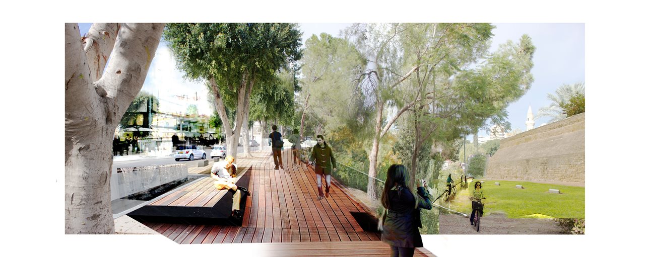 Στο επίπεδο του δρόμου, το βόρειο πεζοδρόμιο εκτείνεται αρχικά ως ξύλινη διαδρομή (deck) πάνω σε ελαφριά κατασκευή με πασσαλώσεις που λειτουργεί ως «μπαλκόνι» προς τα πρανή της τάφρου και συνεχίζει στα όρια του «κήπου Αγίου Αντωνίου» με εναλλασσόμενες διαμορφώσεις ξύλινης διαδρομής τύπου deck ή χυτών δαπέδων. Κατά μήκος όλης της διαδρομής δημιουργούνται σημεία στάσης και θέασης του Μνημείου των ενετικών τειχών και προσπέλασης προς το επίπεδο της τάφρου με 3 κλίμακες ελαφριάς κατασκευής. O αρχιτεκτονικός σχεδιασμός κάνει χρήση υδάτινων στοιχείων, καθιστικών και διαμορφώσεων λεκανών πρασίνου. Η ανάπλαση περιλαμβάνει πλήρη τοπιοτέχνηση του χώρου με εξυγίανση του υφιστάμενου πρασίνου και αύξηση της ψηλής και χαμηλής βλάστησης, φωτισμό νέας τεχνολογίας εξοικονόμησης ενέργειας, αναβάθμιση και ένταξη των υφιστάμενων προτομών και μνημείων που περιλαμβάνονται στα όρια της περιοχής, σταθμό ενοικίασης ποδηλάτων του Δήμου Λευκωσίας, χώρο parking ποδηλάτων και αναβάθμιση των υποδομών των υπηρεσιών κοινής ωφελείας.