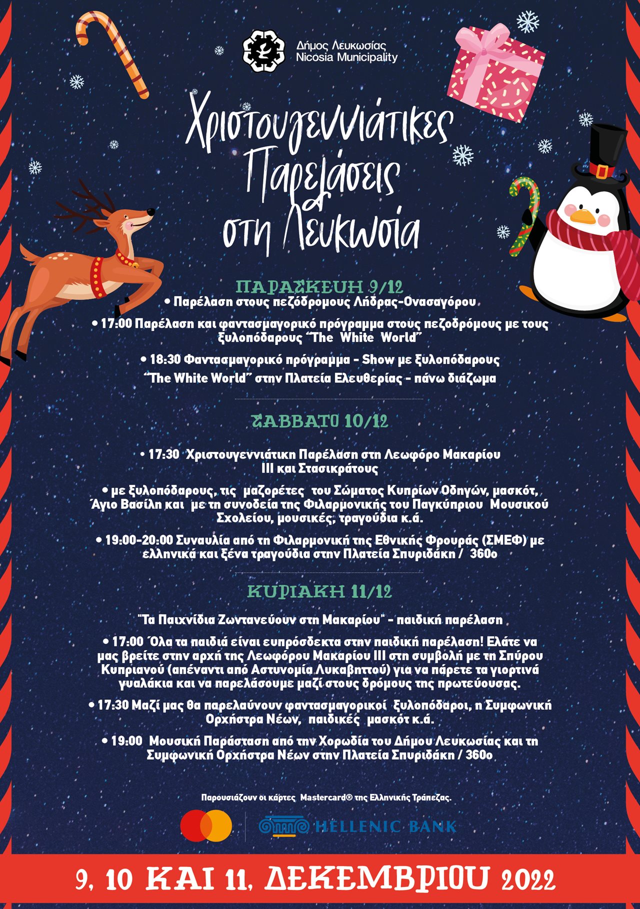 Η εορταστική ατμόσφαιρα συνεχίζεται, παράλληλα, με πλήθος χριστουγεννιάτικων εκδηλώσεων σε διάφορα σημεία της πόλης για μικρούς και μεγάλους. Οι κυκλοφοριακές ρυθμίσεις που θα πραγματοποιηθούν για την διεξαγωγή του μαραθωνίου, δεν θα επηρεάσουν την υπόλοιπη λειτουργία της πρωτεύουσας, καθώς η αγορά και τα καταστήματα θα παραμείνουν ανοικτά και έτοιμα να υποδεχθούν τους κατοίκους που θα επιλέξουν να απολαύσουν την βόλτα στο κέντρο της πόλης.