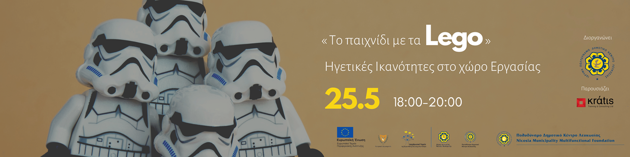 Το Πολυδύναμο Δημοτικό Κέντρο Λευκωσίας, στο πλαίσιο του Έργου Κέντρο Ενημέρωσης και Επιμόρφωσης για την Απασχόληση και την Επιχειρηματική δράση ΚΕΕΑΕΔ και σε συνεργασία με Kratis Training and Consulting διοργανώνει την διαδραστική εκπαίδευση με θέμα «Το παιχνίδι με τα Lego». Ηγετικές ικανότητες στο χώρο εργασίας.