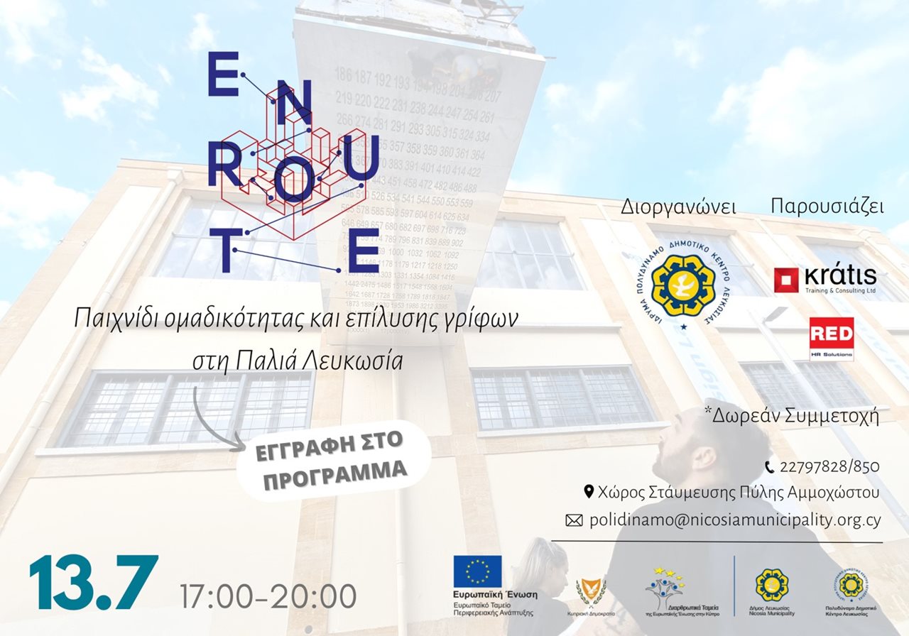 Το ΚΕΕΑΕΔ του Πολυδύναμου Δημοτικού Κέντρου Λευκωσίας και η Kratis Consulting σας προσκαλούν στο παιχνίδι En route για ένα απόγευμα εξερεύνησης στη Λευκωσία γεμάτο γνώση και διασκέδαση την Πέμπτη 13 Ιουλίου 2023.