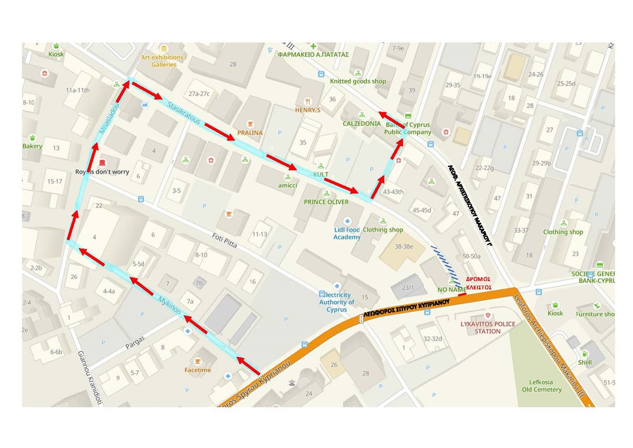 Επιπρόσθετα, κατά τις ίδιες ώρες, θα αντιστραφεί προσωρινά η μονόδρομη κατεύθυνση της οδoύ Μνασιάδου, με επιτρεπόμενη κατεύθυνση από τη Μνασιάδου προς τον ιδιωτικό χώρο στάθμευσης οχημάτων, με έξοδο από την οδό Στασικράτους προς το βόρειο τμήμα της Λεωφόρο Αρχ. Μακαρίου Γ’, με επιτρεπόμενη αριστερόστροφη στροφή προς τη Λεωφόρο Αρχ. Μακαρίου Γ’.