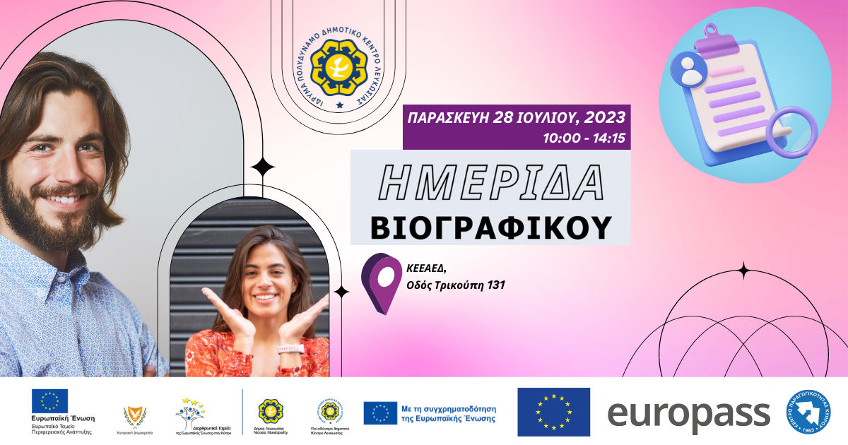 Το Πολυδύναμο Δημοτικό Κέντρο Λευκωσίας στο πλαίσιο του Έργου ΚΕΕΑΕΔ -Κέντρο Ενημέρωσης και Επιμόρφωσης για την Απασχόληση και την Επιχειρηματική δράση και σε συνεργασία με το Κέντρο Παραγωγικότητας Κύπρου του Υπουργείου Εργασίας και Κοινωνικών Ασφαλίσεων, ως το Εθνικό Κέντρο Europass (ΕΚΕ) Κύπρου, διοργανώνει δωρεάν βιωματικό εργαστήριο Europass στα ελληνικά διάρκειας τεσσάρων (4) ωρών.