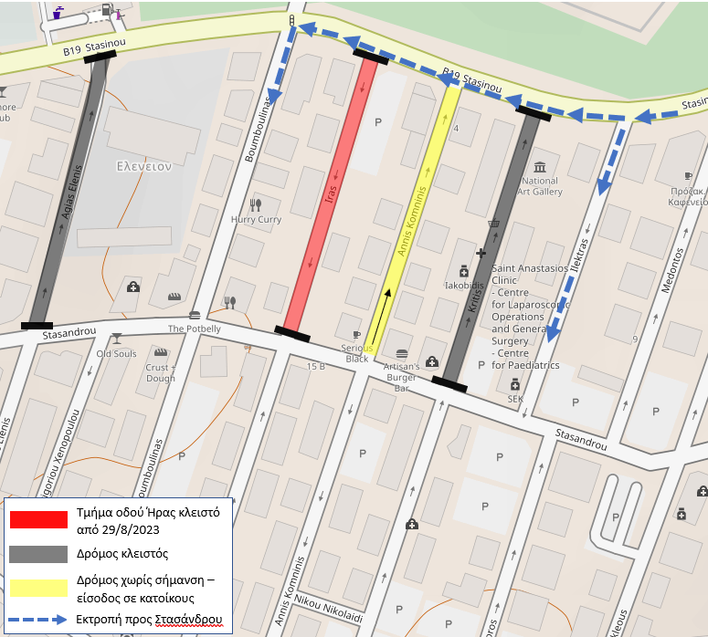 Η τροχαία κίνηση από την οδό Στασίνου προς της οδό Στασάνδρου θα γίνεται δια μέσου των οδών Μπουμπουλίνας και Ηλέκτρας, όπως υποδεικνύεται στο σχεδιάγραμμα, ενώ για τις επηρεαζόμενες ιδιοκτησίες της οδού Ήρας, θα υπάρχει πρόσβαση από την οδό Άννης Κομνηνής.