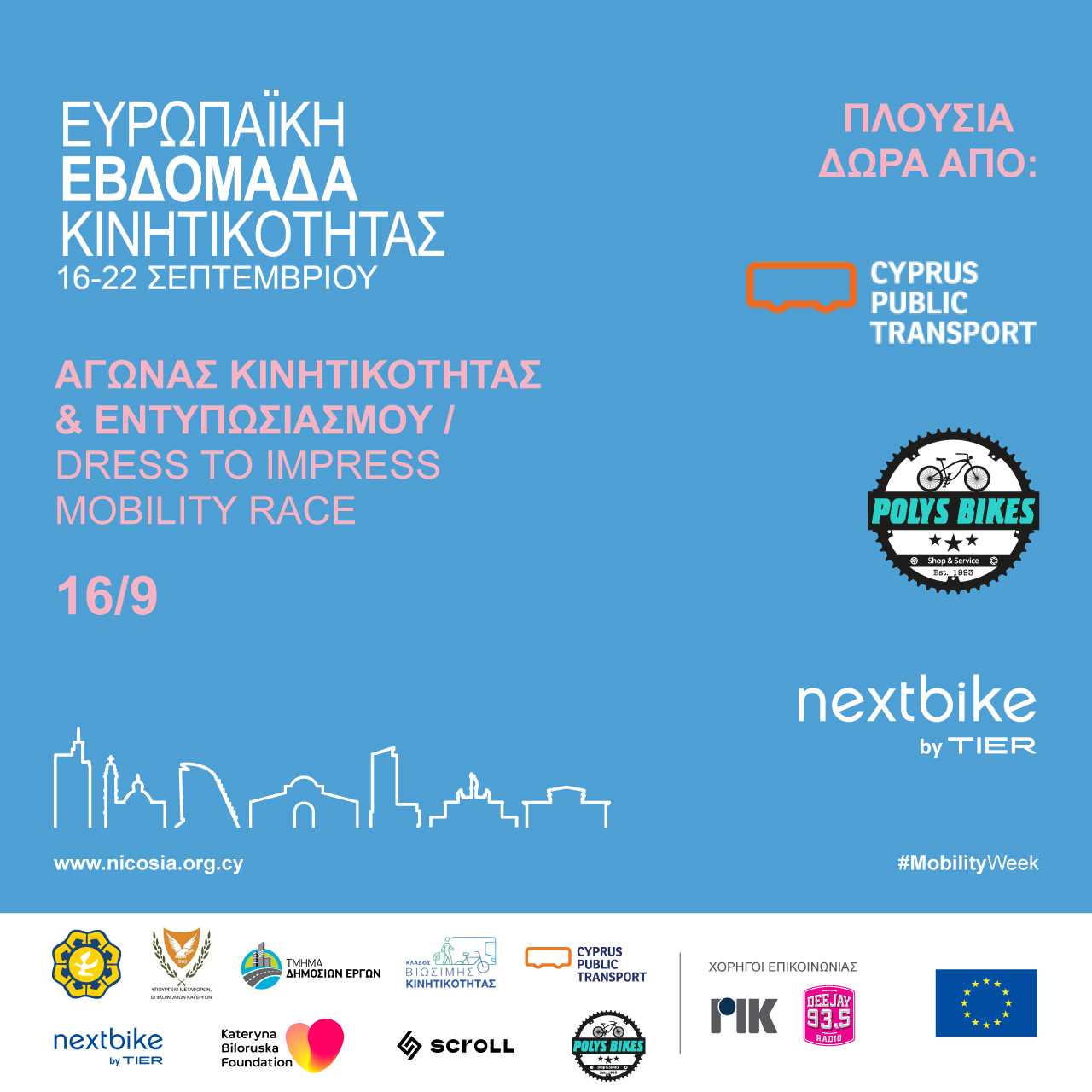 Στο πλαίσιο των εκδηλώσεων της Ευρωπαϊκής Εβδομάδας Κινητικότητας ο Δήμος Λευκωσίας πληροφορεί το κοινό ότι το Σάββατο 16 Σεπτεμβρίου 2023, από τις 4 μέχρι τα μεσάνυχτα θα κλείσει το βόρειο τμήμα της Λεωφ. Μακαρίου και θα πραγματοποιηθεί μια μεγάλη εκδήλωση με τίτλο «Dress to impress mobility event». Πρόκειται για μια παρέλαση όπου μπορούν να συμμετάσχουν μικροί και μεγάλοι, οικογένειες, οργανωμένα σύνολα και θα μπορούν να επιλέξουν ως μέσο μετακίνησης το ποδήλατο, το σκούτερ, το πατίνι, roller skates ή πεζοί και θα έχουν ως βασική προϋπόθεση συμμετοχής το dress code! Θα επιτρέπονται τα καπέλα, τα φτερά, οι παγιέτες και τα λαμέ! Οι συμμετέχοντες θα περάσουν από μια σύντομη διαδρομή, γύρω από την Μακαρίου και θα κλείσει με ένα εντυπωσιακό πάρτι με DJ, διαγωνισμούς και δώρα, στη Λεωφ. Μακαρίου, στην πλατεία Σπυριδάκι - κτήριο 360.