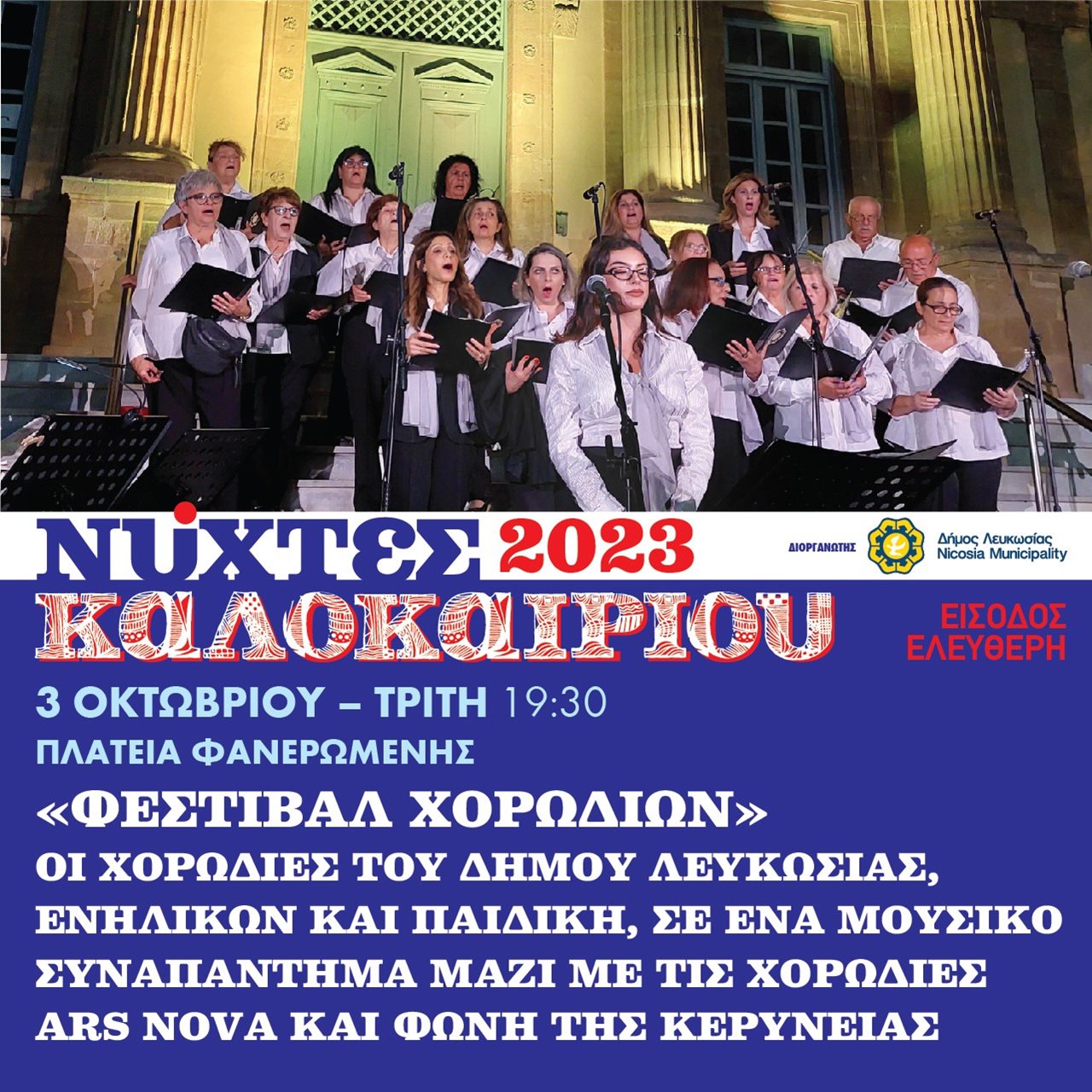 Οι εκδηλώσεις Νύχτες Καλοκαιριού 2023 ολοκληρώνται την Τριτη 3 Οκτωβρίου στις 7:30 το βράδυ στην Πλατεία Φανερωμένης με Φεστιβάλ Χορωδιών.
