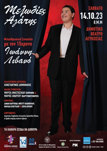 Ο πολυβραβευμένος 15χρονος τενόρος, Ιωάννης Λιβανός, εμπνευστής της Φιλανθρωπικής Συναυλίας ΜΕΛΩΔΙΕΣ ΑΓΑΠΗΣ θα ερμηνεύσει τραγούδια σπουδαίων Ελλήνων και Ξένων Συνθετών, με την συνοδεία 6μελούς Ορχήστρας υπό την διεύθυνση του καταξιωμένου Μαέστρου από τη Βιέννη, Κωνσταντίνου Δημηνάκη το Σάββατο 14 Οκτωβρίου 2023, στις 20:00 στο Δημοτικό Θέατρο Λευκωσίας.