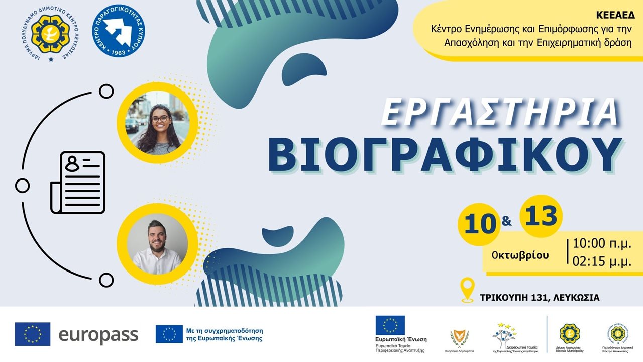 Το Πολυδύναμο Δημοτικό Κέντρο Λευκωσίας στο πλαίσιο του Έργου ΚΕΕΑΕΔ -Κέντρο Ενημέρωσης και Επιμόρφωσης για την Απασχόληση και την Επιχειρηματική δράση και σε συνεργασία με το Κέντρο Παραγωγικότητας Κύπρου του Υπουργείου Εργασίας και Κοινωνικών Ασφαλίσεων, ως το Εθνικό Κέντρο Europass (ΕΚΕ) Κύπρου, διοργανώνει δωρεάν διήμερο βιωματικό εργαστήριo βιογραφικού και δεξιοτήτων απασχόλησης στα ελληνικά διάρκειας τεσσάρων (4) ωρών.
