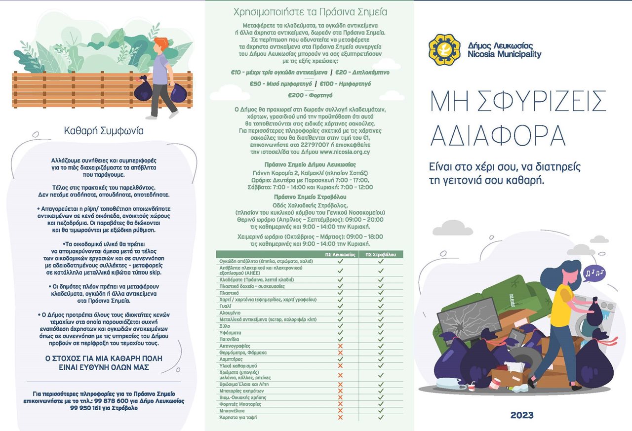 Υπενθυμίζεται ότι οι δημότες μπορούν να μεταφέρουν κλαδεύματα και αντικείμενα στο πράσινο σημείο του Δήμου Λευκωσίας που βρίσκεται στο χώρο του τμήματος Καθαριότητας, στην οδό Γιάννη Κορομία 2 στο Καϊμακλί και στο πράσινο σημείο Στροβόλου, στην οδό Χαλκιδικής πλησίον του κυκλικού κόμβου του Γενικού Νοσοκομείου Λευκωσίας. Στα πράσινα σημεία παραλαμβάνονται δωρεάν διάφορες κατηγορίες αποβλήτων που προέρχονται