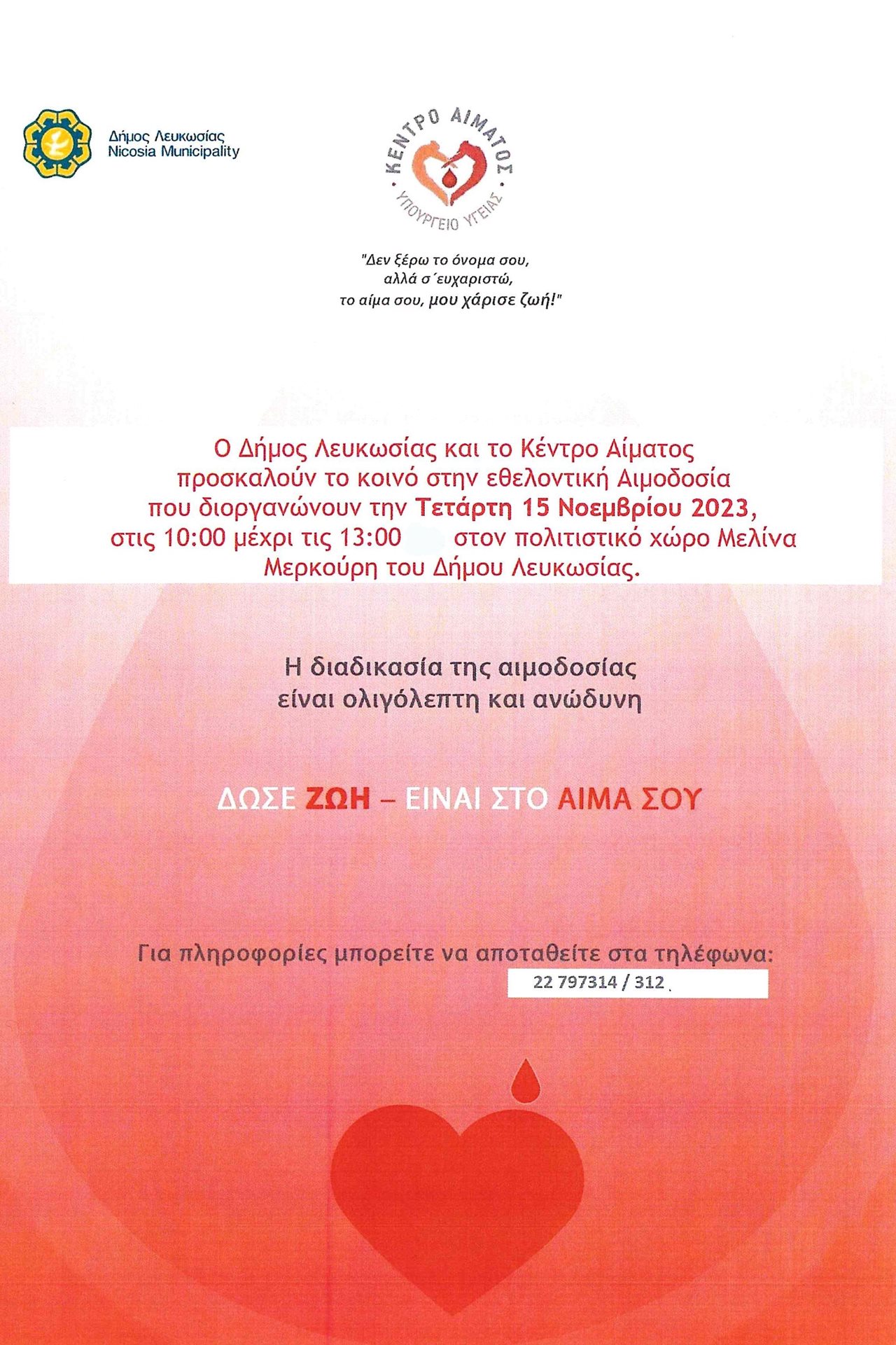 Προσκαλούνται όσοι δημότες θέλουν να δώσουν αίμα και να προσφέρουν αυτό το πολύτιμο δώρο στους συμπολίτες μας να προσέλθουν στον πολιτιστικό χώρο Μελίνα Μερκούρη, Λεωφ. Αθηνάς, 1017 Λευκωσία.
